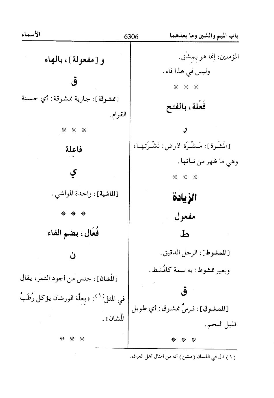 [الممشوق]: فرسٌ ممشوق: أي طويل قليل اللحم.