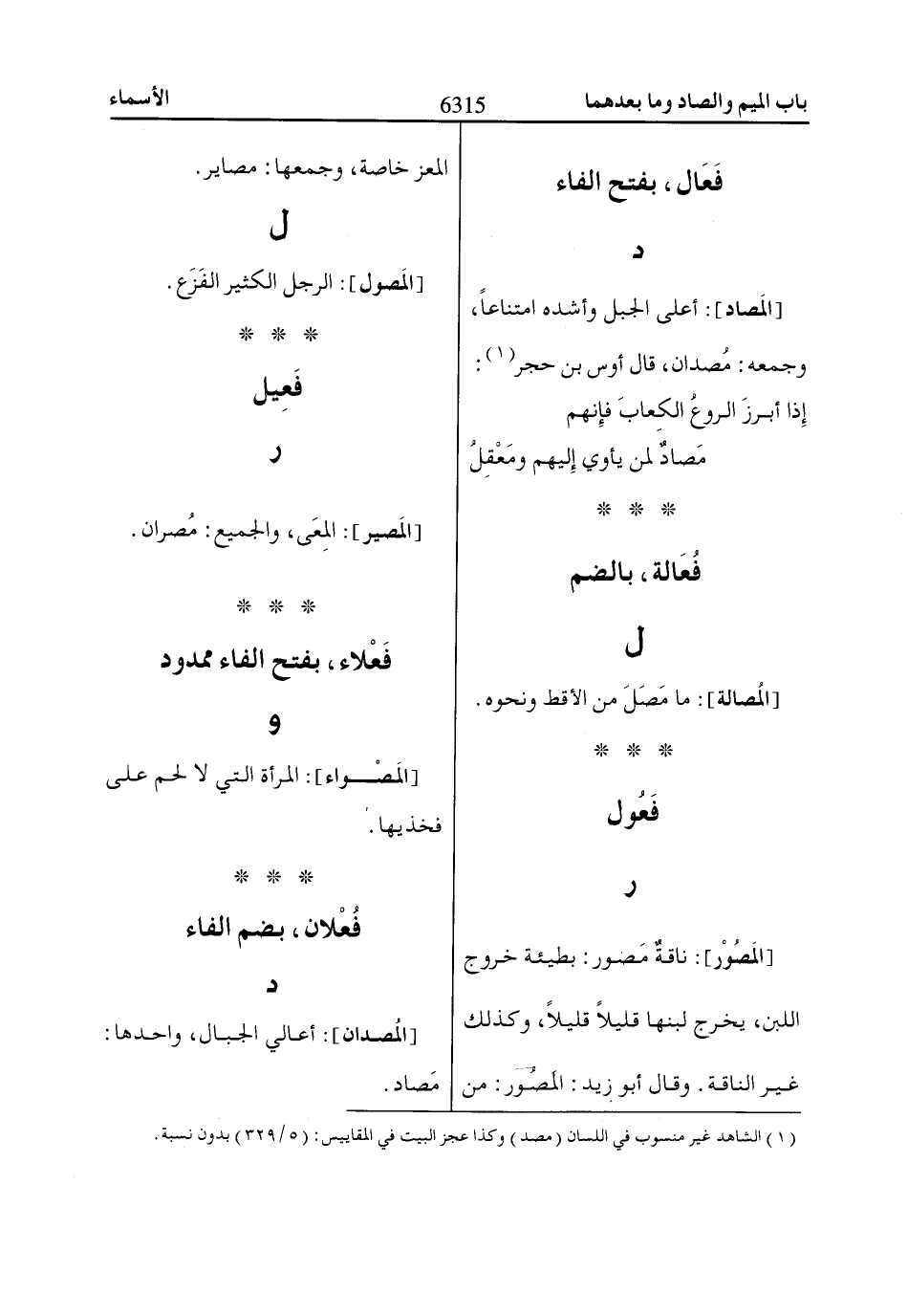 [المَصاد]: أعلى الجبل وأشده امتناعاً، وجمعه: مُصدان، قال أوس بن حجر «1»: