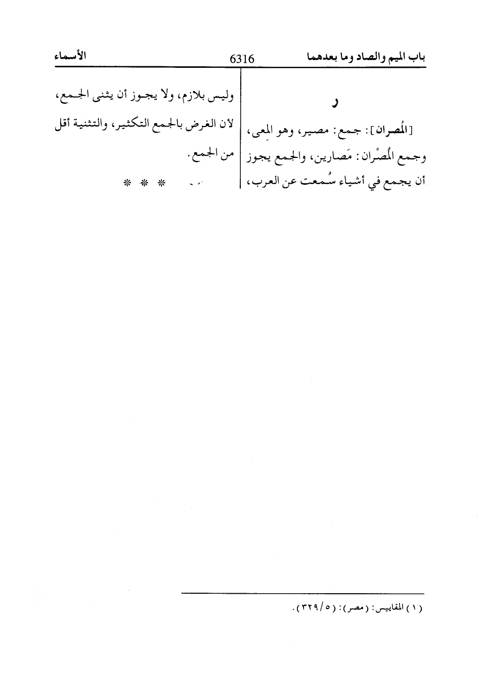 [المُصران]: جمع: مصير، وهو المِعى، وجمع المُصْران: مَصارين، والجمع يجوز أن يجمع في أشياء سُمعت عن العرب، وليس بلازم، ولا يجوز أن يثنى الجمع، لأن الغرض بالجمع التكثير، والتثنية أقل من الجمع «1».