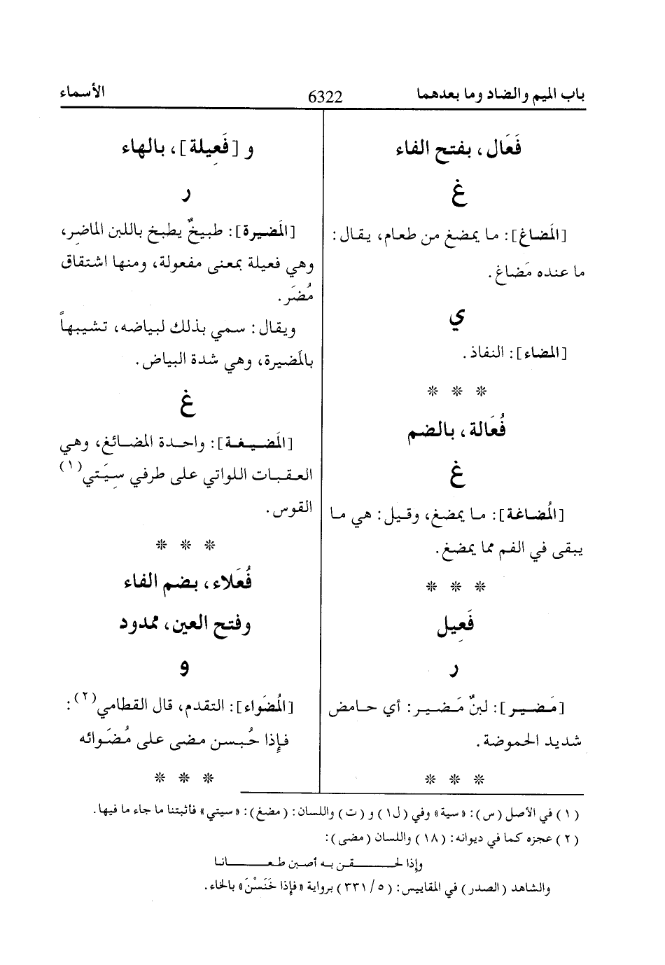 [المَضيرة]: طبيخٌ يطبخ باللبن الماضِر، وهي فعيلة بمعنى مفعولة، ومنها اشتقاق مُضَر.