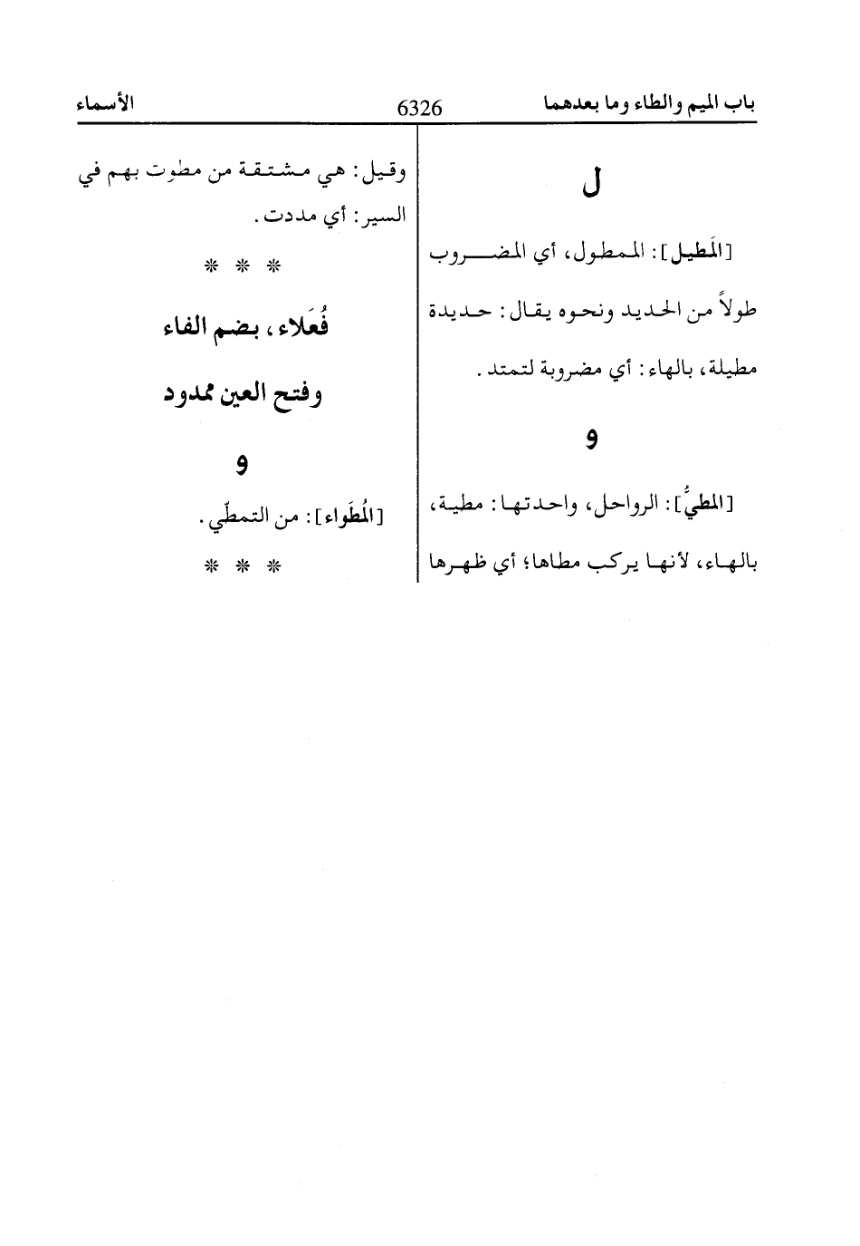 [المَطيل]: الممطول، أي المضروب طولًا من الحديد ونحوه يقال: حديدة مطيلة، بالهاء: أي مضروبة لتمتد.