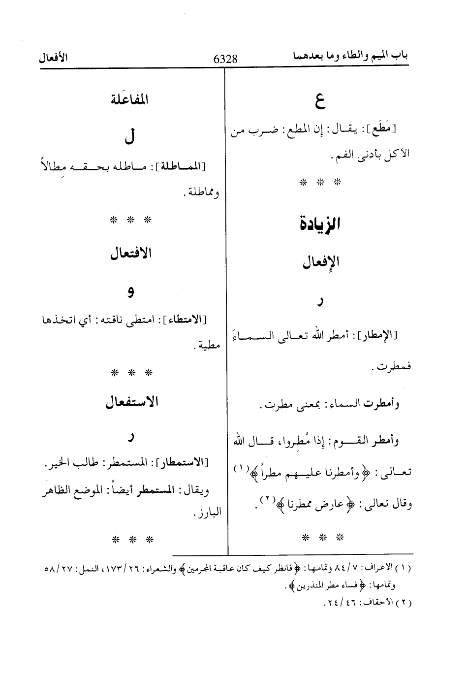 وأمطر القوم: إِذا مُطِروا، قال اللّاه تعالى: وَأَمْطَرْناا عَلَيْهِمْ مَطَراً* «1» وقال تعالى: عاارِضٌ مُمْطِرُناا «2».