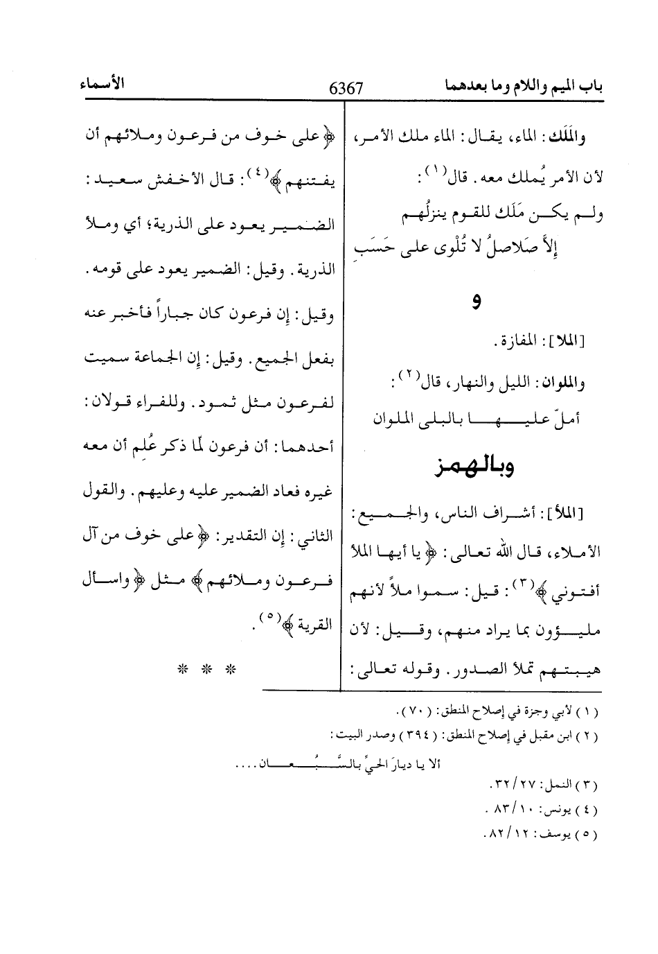 الأملاء، قال اللّاه تعالى: ياا أَيُّهَا الْمَلَأُ أَفْتُونِي* «3»: قيل: سموا ملأً لأنهم مليؤون بما يراد منهم، وقيل: لأن هيبتهم تملأ الصدور. وقوله تعالى: