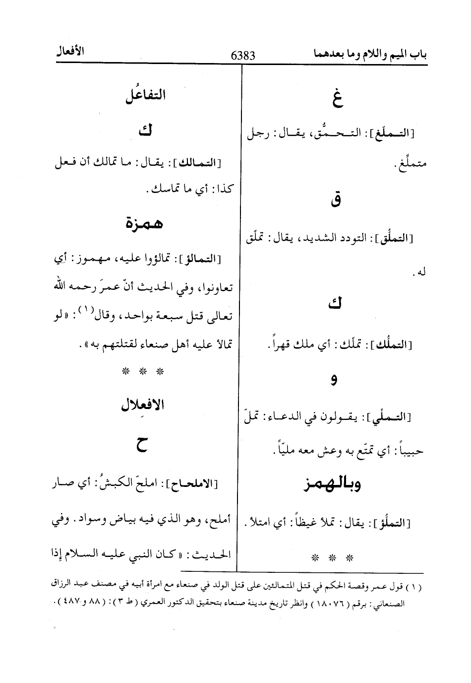 (1) قول عمر وقصة الحكم في قتل المتمالئين على قتل الولد في صنعاء مع امرأة أبيه في مصنف عبد الرزاق الصنعاني: برقم (18076) وانظر تاريخ مدينة صنعاء بتحقيق الدكتور العمري (ط 3): (88 و 487).