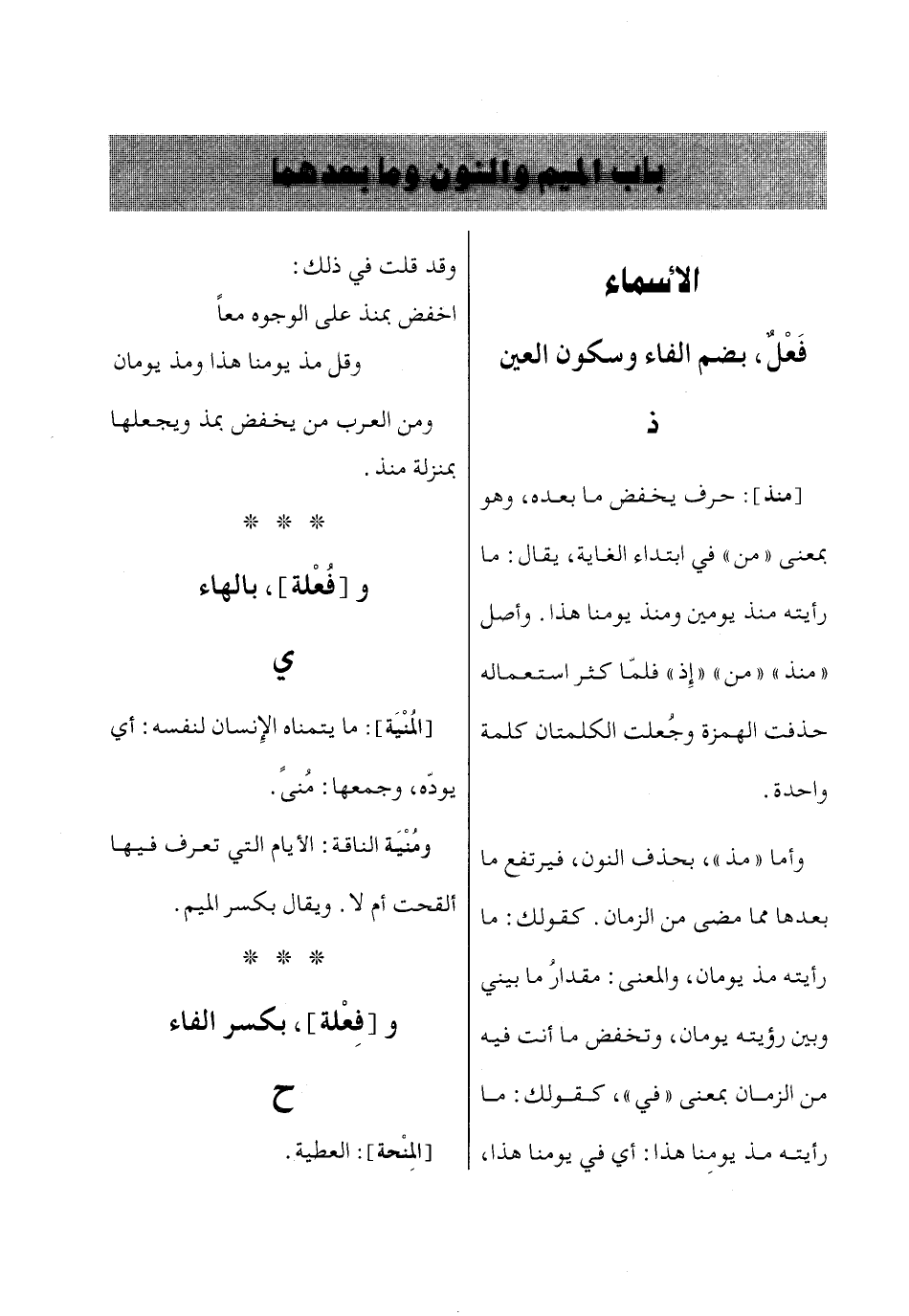 [منذ]: حرف يخفض ما بعده، وهو بمعنى «من» في ابتداء الغاية، يقال: ما رأيته منذ يومين ومنذ يومنا هذا. وأصل «منذ» «من» «إِذ» فلمّا كثر استعماله حذفت الهمزة وجُعلت الكلمتان كلمة واحدة.