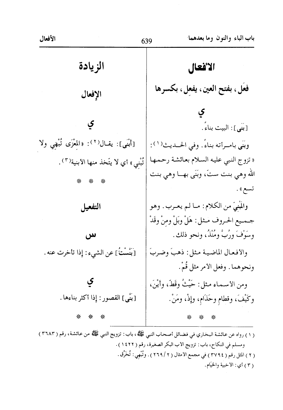 والمَبْنِيّ من الكلام: ما لم يعرب. وهو جميع الحروف مثل: هَلْ وبَلْ ومِنْ وقَدْ وسَوْفَ ورُبَّ ومُنْذُ، ونحو ذلك.
