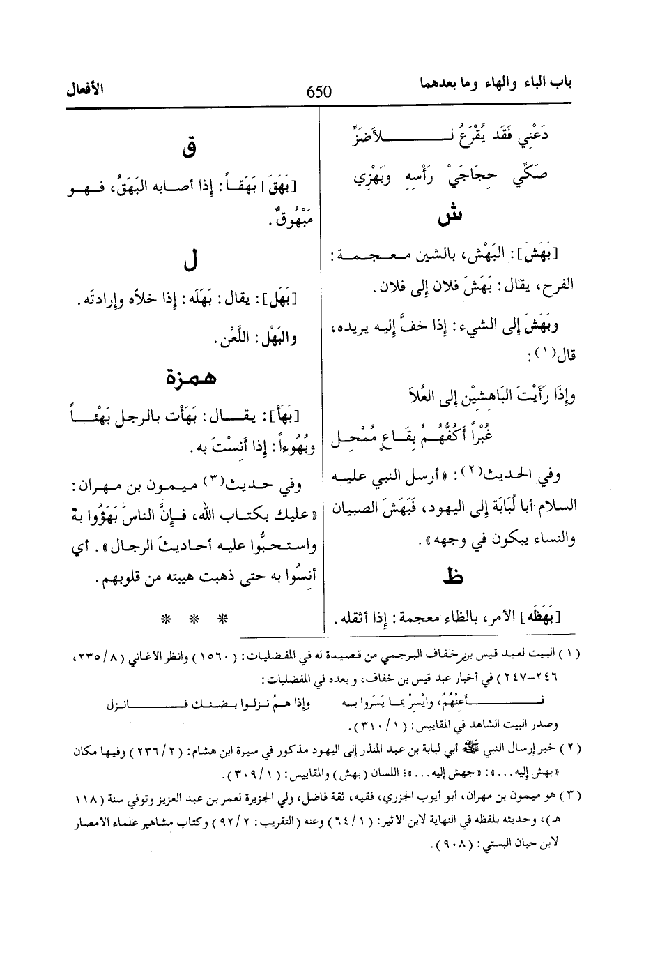 [بَهَأَ]: يقال: بَهَأْت بالرجل بَهْئاً وبُهُوءاً: إِذا أَنِسْتَ به.