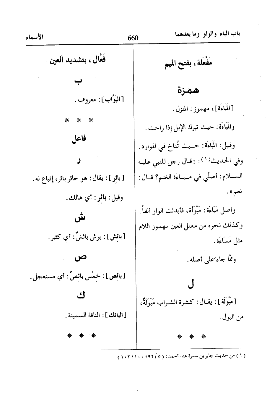 . وأصل مَبَاءَة: مَبْوَأَة، فأبدلت الواو ألفاً.