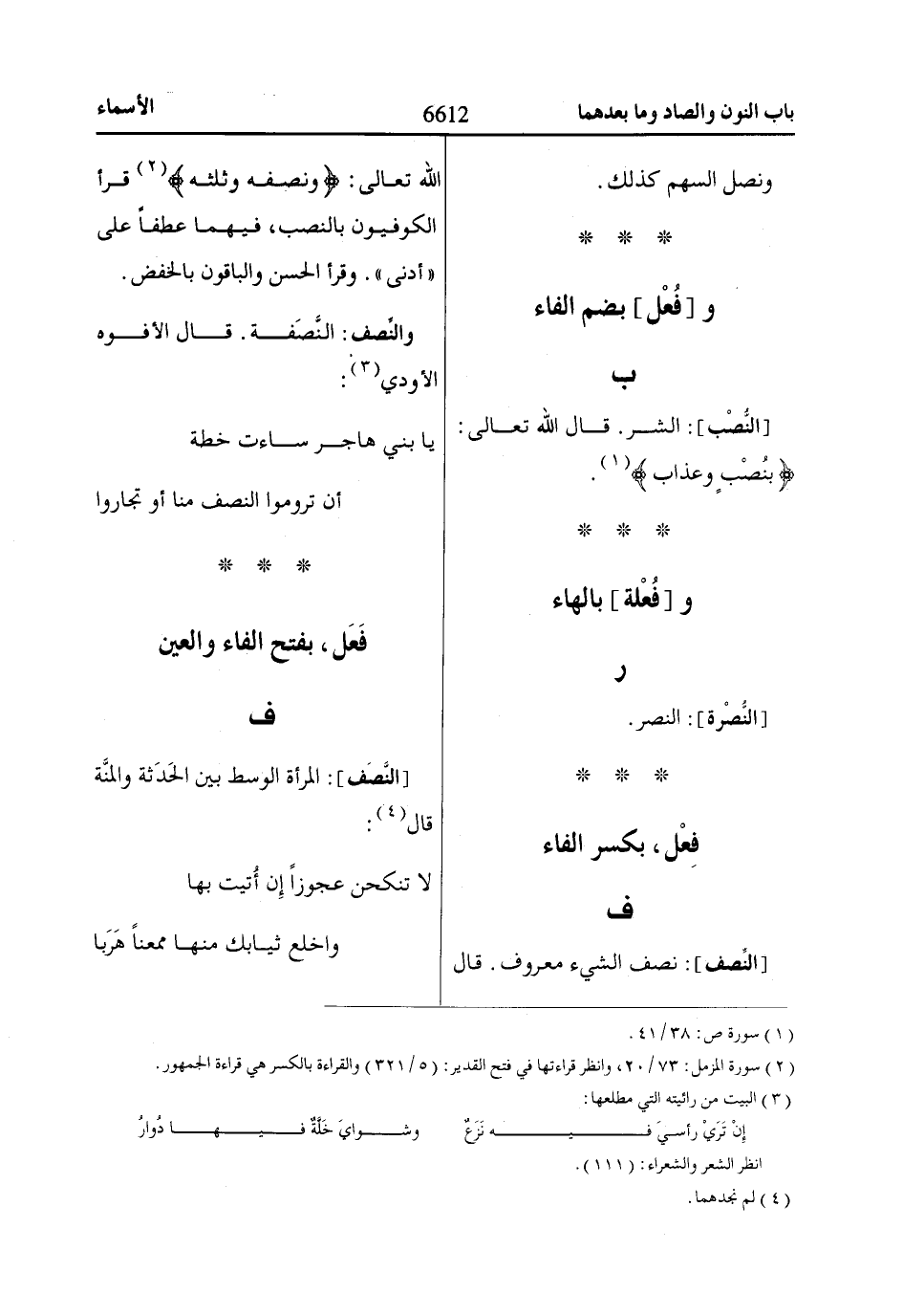 [النِّصف]: نصف الشيء معروف. قال اللّاه تعالى: وَنِصْفَهُ وَثُلُثَهُ «2» قرأ الكوفيون بالنصب، فيهما عطفاً على «أَدْنى». وقرأ الحسن والباقون بالخفض.