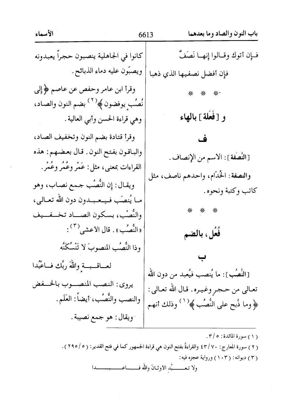 ويقال: إِن النُّصُب جمع نصاب، وهو ما يُنصَب فيعبدون دون اللّاه تعالى، والنُّصْب، بسكون الصاد تخفيف «النُّصُب». قال الأعشى «3»: