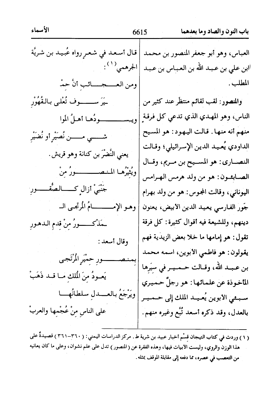 (1) وردت في كتاب التيجان قِسْم أخبار عبيد بن شرية ط. مركز الدراسات اليمني: (360 - 361) قصيدةٌ على هذا الوزن والروي، وليست الأبيات فيها، وهذه الفقرة عن (المنصور) تدل على علم نشوان، وعلى ما كان يعانيه من التعصب في عصره، مما دفعه إِلى مقابلة الموقف بمثله.