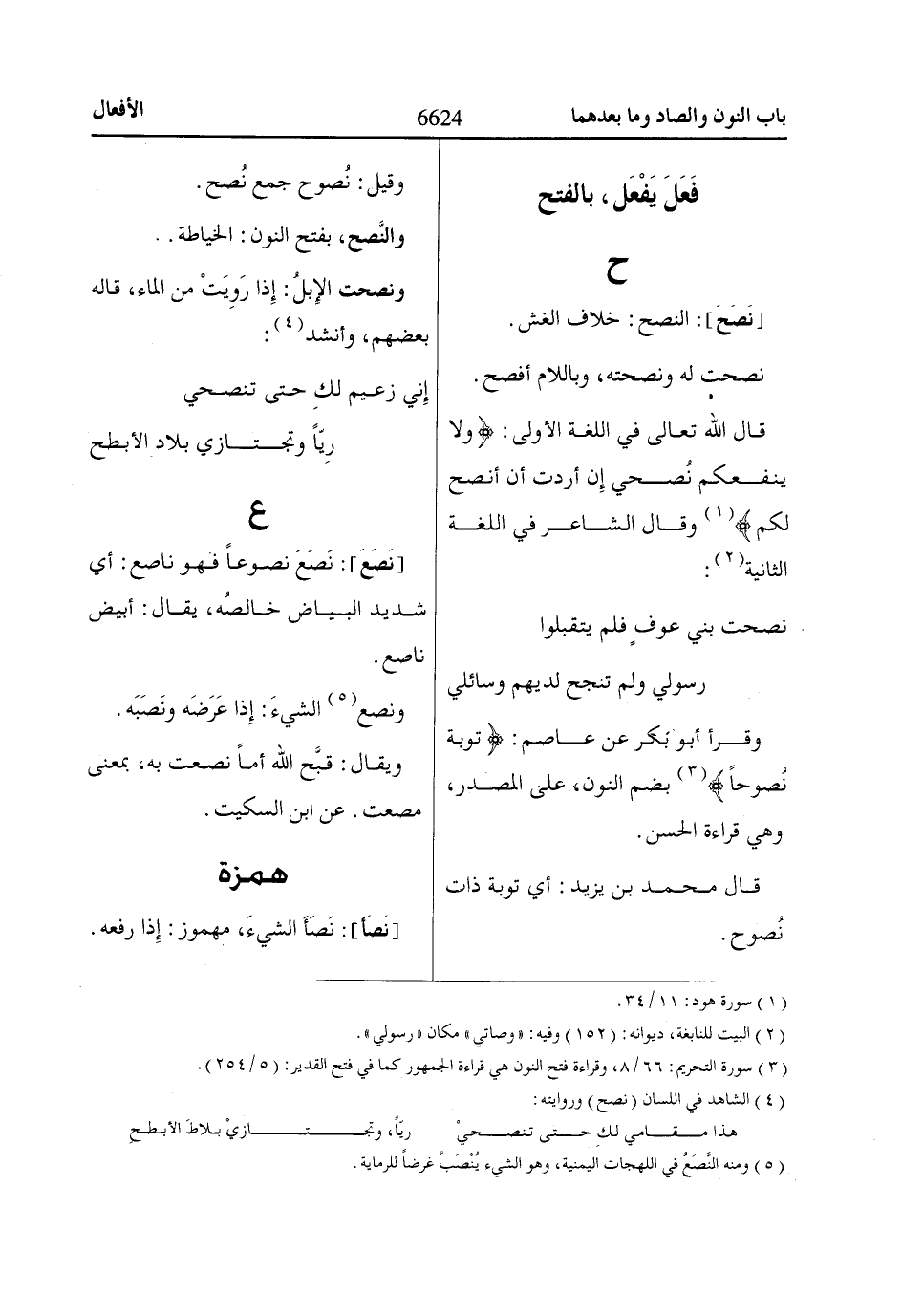 (3) سورة التحريم: 66/ 8، وقراءة فتح النون هي قراءة الجمهور كما في فتح القدير: (5/ 254).