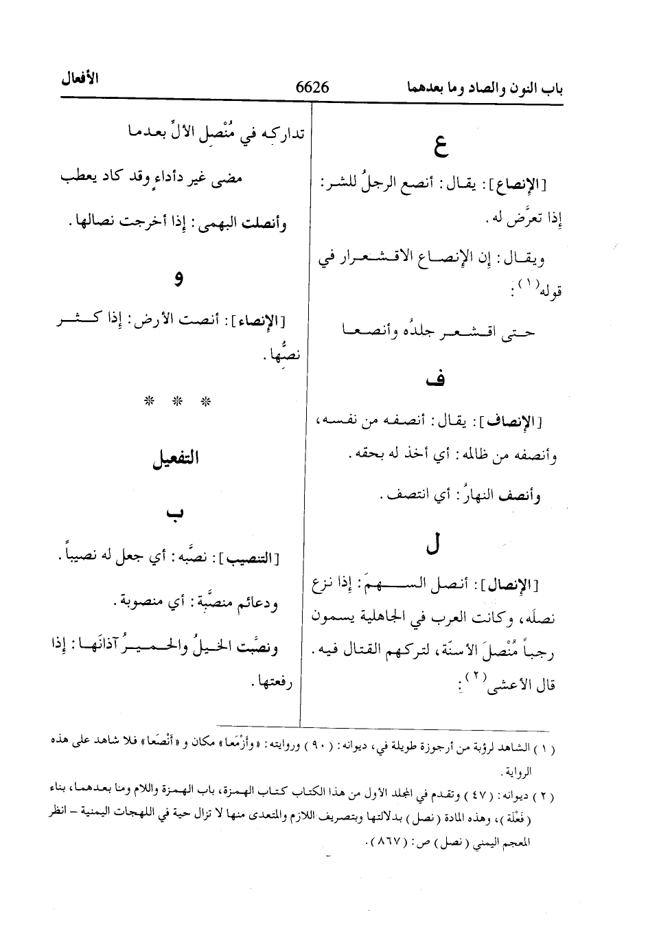 (2) ديوانه: (47) وتقدم في المجلد الأول من هذا الكتاب كتاب الهمزة، باب الهمزة واللام ومنا بعدهما، بناء (فَعْلَة)، وهذه المادة (نصل) بدلالتها وبتصريف اللازم والمتعدى منها لا تزال حية في اللهجات اليمنية- انظر المعجم اليمني (نصل) ص: (867).