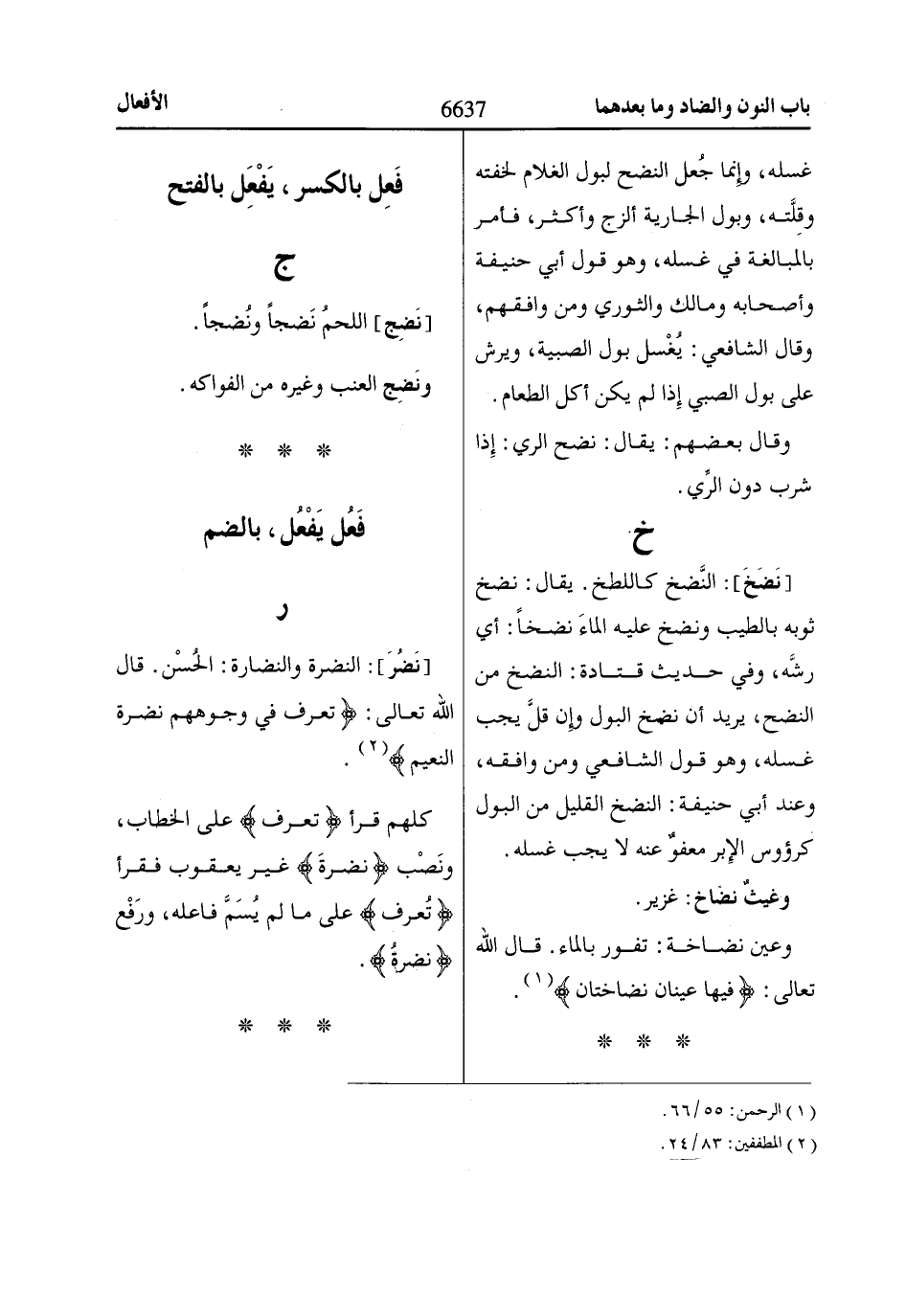 [نَضُرَ]: النضرة والنضارة: الحُسْن. قال اللّاه تعالى: تَعْرِفُ فِي وُجُوهِهِمْ نَضْرَةَ النَّعِيمِ «2».