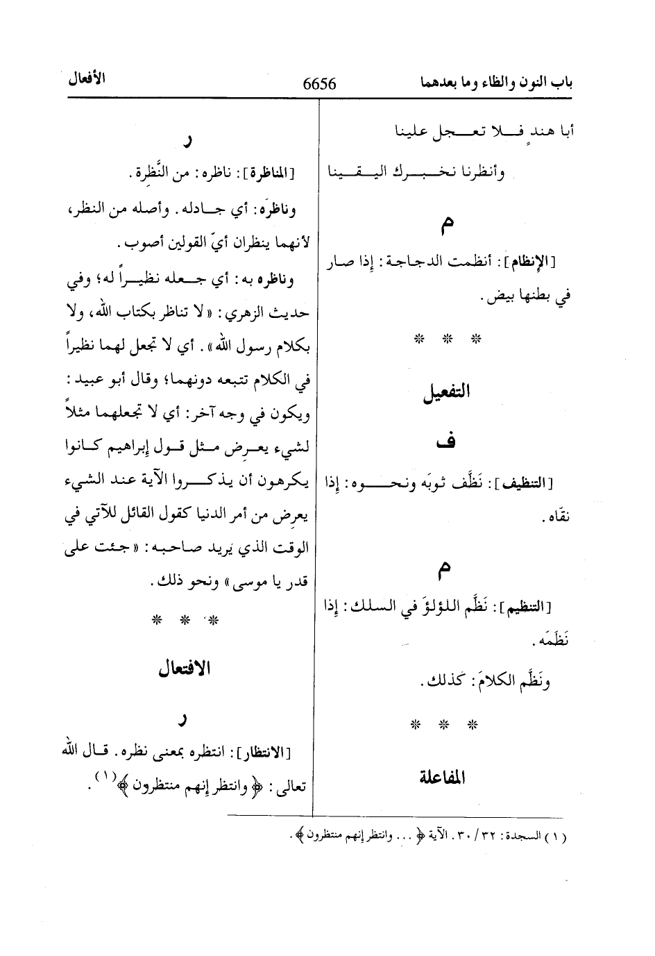 [الانتظار]: انتظره بمعنى نظره. قال اللّاه تعالى: وَانْتَظِرْ إِنَّهُمْ مُنْتَظِرُونَ «1».