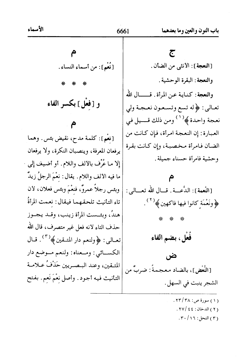 [نِعْم]: كلمة مدح، نقيض بئس. وهما يرفعان المعرفة، وينصبان النكرة، ولا يرفعان إِلا ما عُرِّف بالألف واللام. أو أضيف إِلى ما فيه الألف واللام. يقال: نِعْمَ الرجلُ زيدٌ وبئس رجلًا عمروٌ، فنِعْمَ وبئس فعلان، لأن تاء التأنيث تلحقهما فيقال: نِعمت المرأةُ هندُ، وبئست المرأة زينب، وقد يجوز حذف التاء لأنه فعل غير متصرف، قال اللّاه تعالى: وَلَنِعْمَ داارُ الْمُتَّقِينَ «3». قال الكسائي: ومعناه: ولنعم موضع دار المتقين، وعند البصريين حَذْفُ علامة التأنيث فيه أجود. وأصل نِعْمَ نَعِم. بفتح