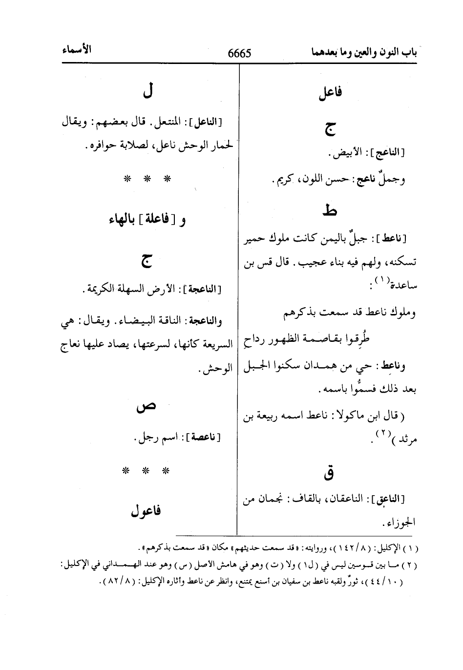 [الناعل]: المنتعل. قال بعضهم: ويقال لحمار الوحش ناعل، لصلابة حوافره.