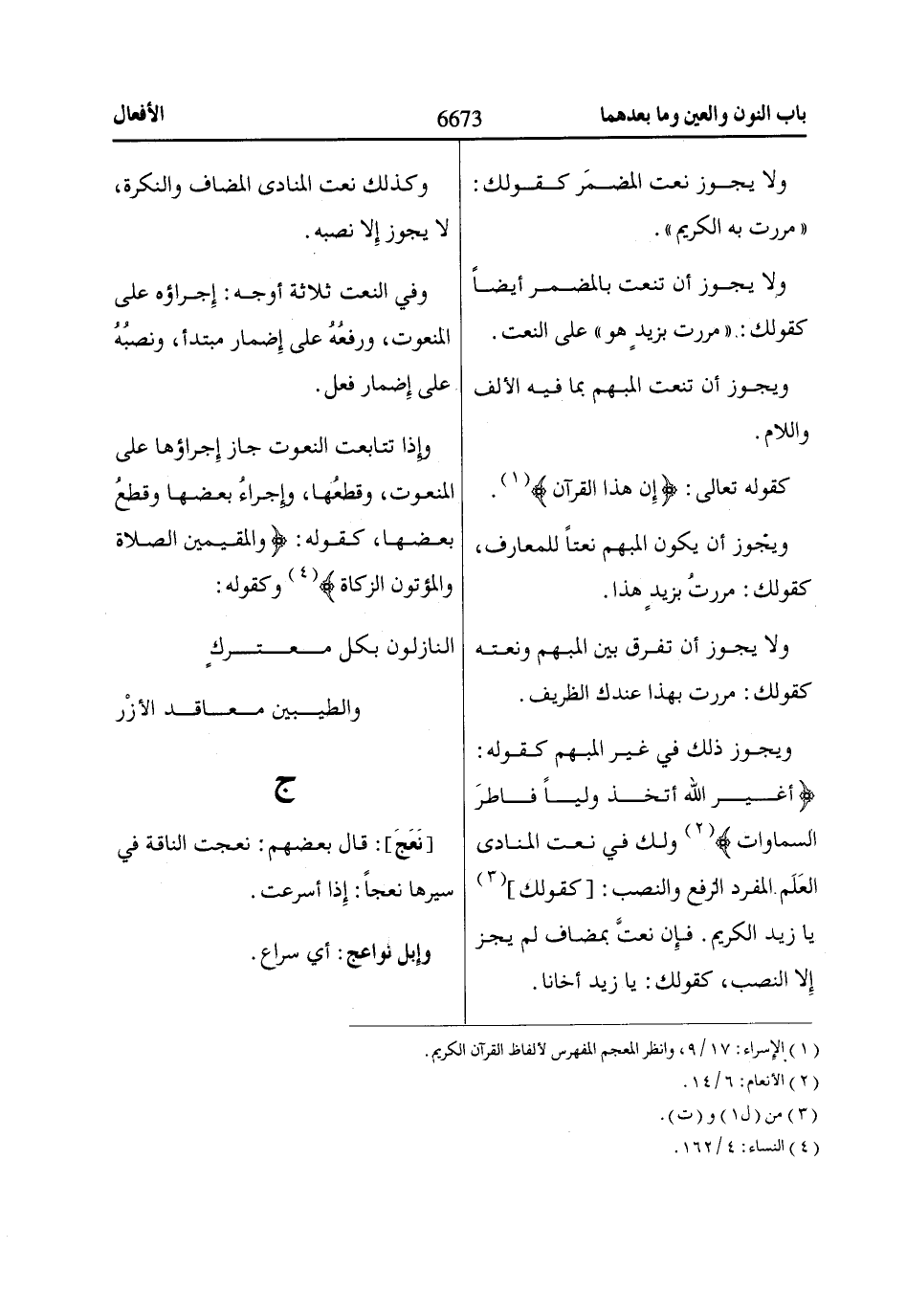 وإِذا تتابعت النعوت جاز إِجراؤها على المنعوت، وقطعُها، وإِجراءُ بعضها وقطعُ بعضها، كقوله: وَالْمُقِيمِينَ الصَّلااةَ وَالْمُؤْتُونَ الزَّكااةَ «4» وكقوله: