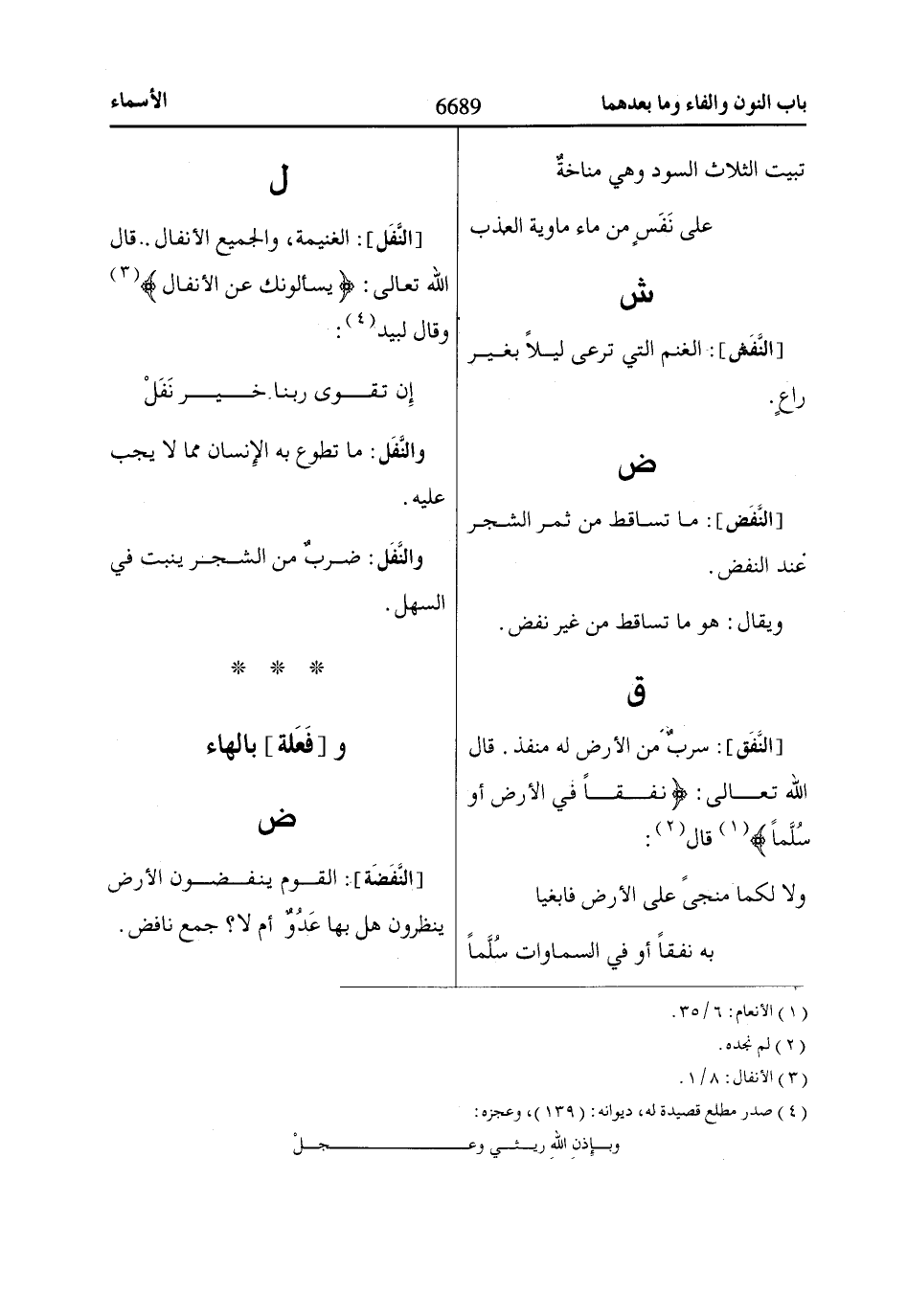 [النَّفَل]: الغنيمة، والجميع الأنفال. قال اللّاه تعالى: يَسْئَلُونَكَ عَنِ الْأَنْفاالِ «3» وقال لبيد «4»: