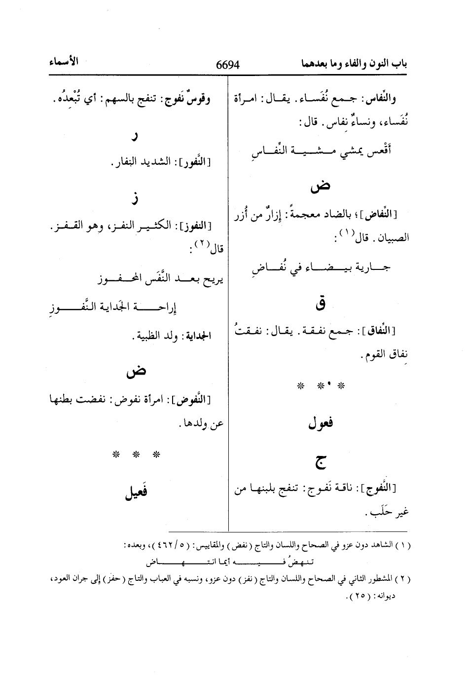 (2) المشطور الثاني في الصحاح واللسان والتاج (نفز) دون عزو، ونسبه في العباب والتاج (حفز) إِلى جران العود، ديوانه: (25).