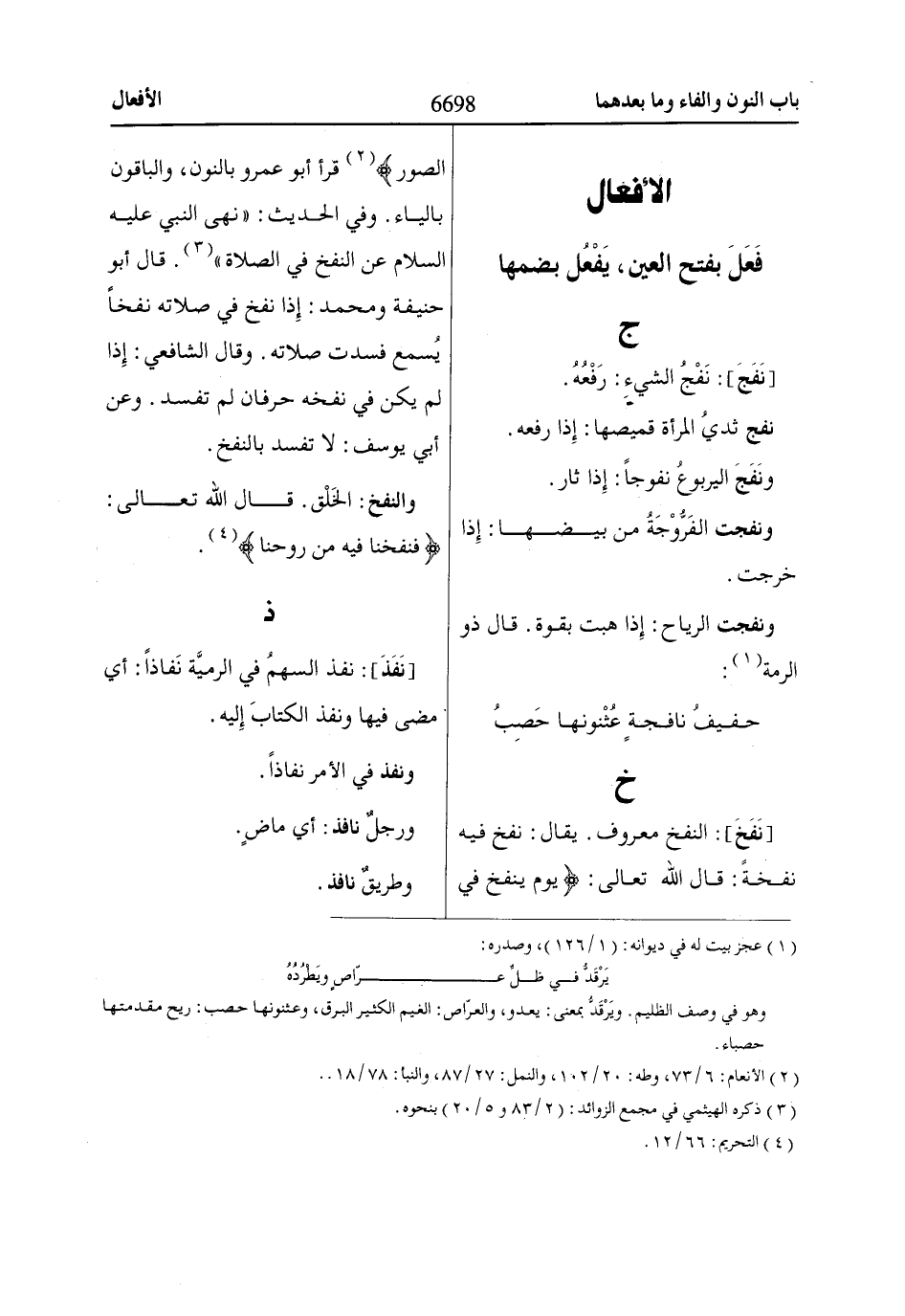 [نَفَخَ]: النفخ معروف. يقال: نفخ فيه نفخةً: قال اللّاه تعالى: يَوْمَ يُنْفَخُ فِي الصُّورِ* «2» قرأ أبو عمرو بالنون، والباقون بالياء.