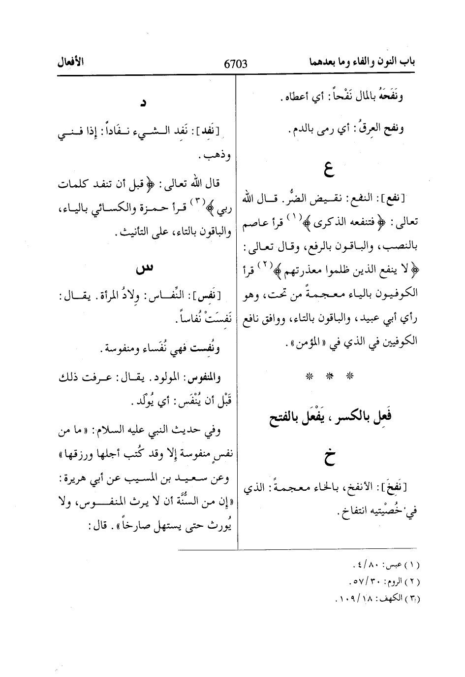 [نفع]: النفع: نقيض الضُّر. قال اللّاه تعالى: فَتَنْفَعَهُ الذِّكْرى «1» قرأ عاصم بالنصب، والباقون بالرفع، وقال تعالى:
