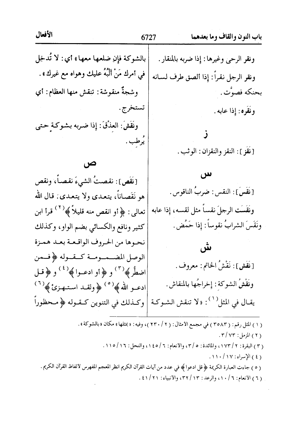 [نَقَص]: نقصتُ الشيءَ نقصاً، ونقص هو نَقَصاناً، يتعدى ولا يتعدى. قال اللّاه تعالى: أَوِ انْقُصْ مِنْهُ قَلِيلًا «2» قرأ ابن كثير ونافع والكسائي بضم الواو، وكذلك نحوها من الحروف الواقعة بعد همزة الوصل المضمومة كقوله فَمَنِ اضْطُرَّ* «3» وأَوِ ادْعُوا «4» وقُلِ ادْعُوا اللّاهَ «5» وَلَقَدِ اسْتُهْزِئَ* «6» وكذلك في التنوين كقوله مَحْظُوراً