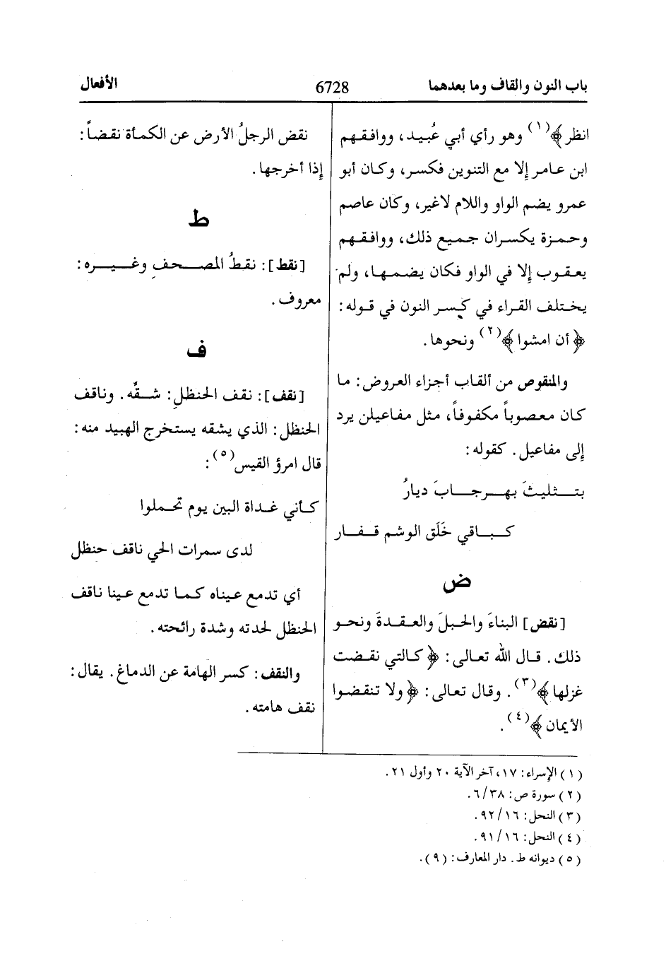 [نقض] البناءَ والحبلَ والعقدةَ ونحو ذلك. قال اللّاه تعالى: كَالَّتِي نَقَضَتْ غَزْلَهاا «3». وقال تعالى: وَلاا تَنْقُضُوا الْأَيْماانَ «4».