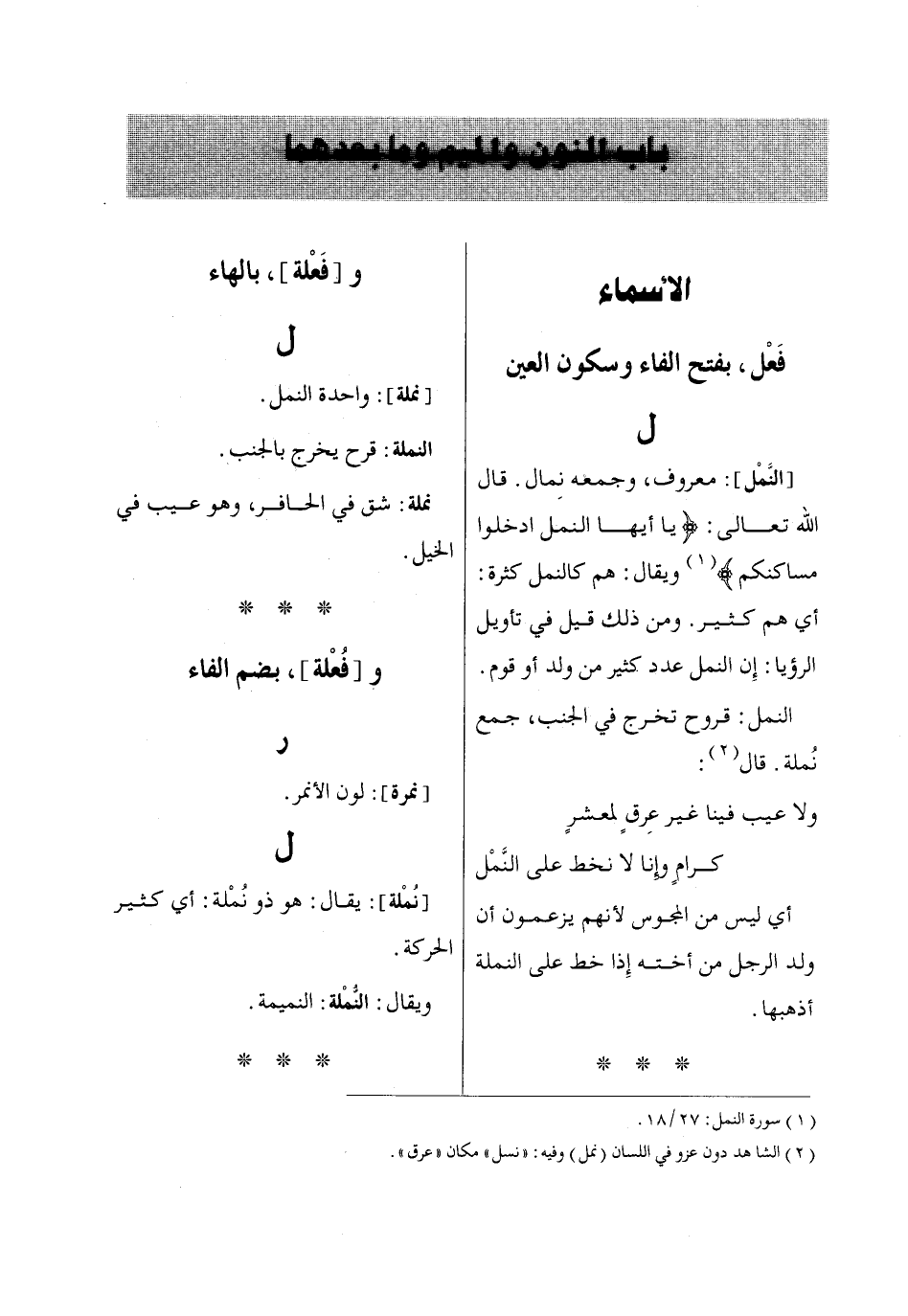 [النَّمْل]: معروف، وجمعه نِمال. قال اللّاه تعالى: ياا أَيُّهَا النَّمْلُ ادْخُلُوا مَسااكِنَكُمْ «1» ويقال: هم كالنمل كثرة: