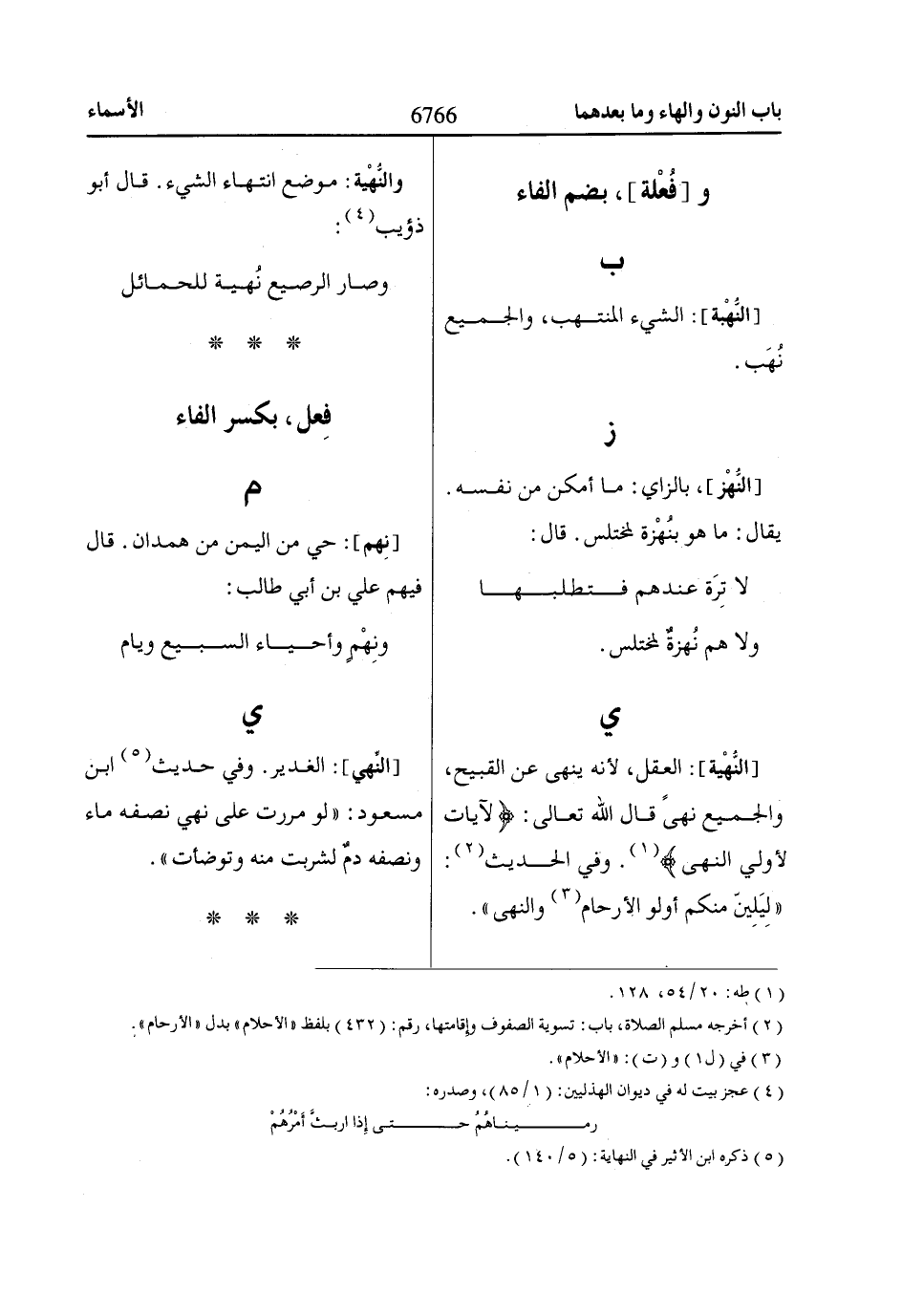 [النُّهْية]: العقل، لأنه ينهى عن القبيح، والجميع نهىً قال اللّاه تعالى: لَآيااتٍ لِأُولِي النُّهى* «1».