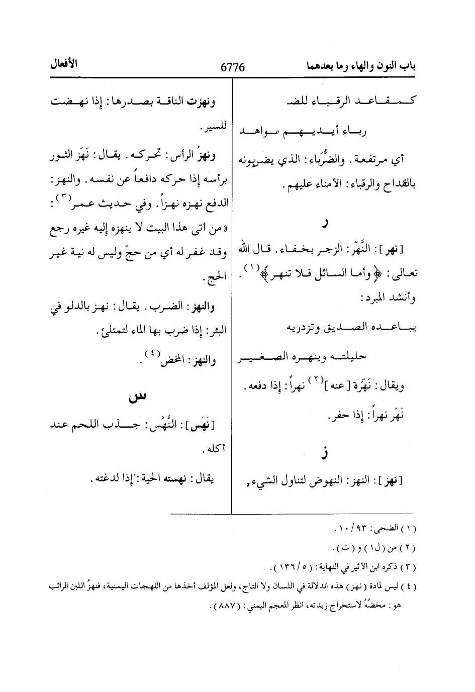 (4) ليس لمادة (نهز) هذه الدلالة في اللسان ولا التاج، ولعل المؤلف أخذها من اللهجات اليمنية، فنهزُ اللبن الرائب هو: مخضُهُ لاستخراج زبدته، انظر المعجم اليمني: (887).