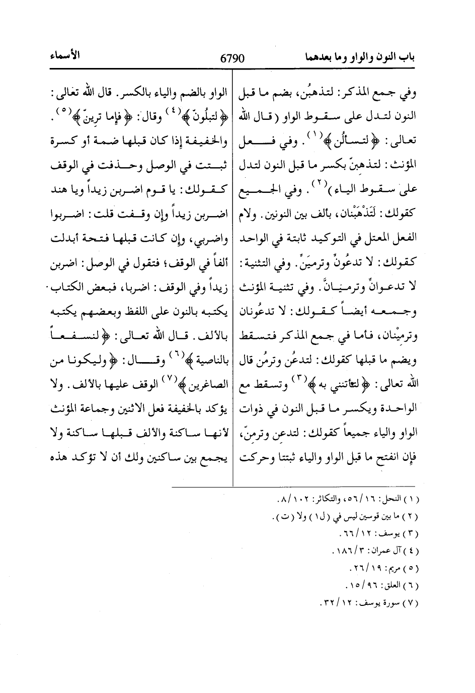 وفي جمع المذكر: لتذهبُن، بضم ما قبل النون لتدل على سقوط الواو (قال اللّاه تعالى: لَتُسْئَلُنَّ* «1». وفي فعل المؤنث: لتذهِبنّ بكسر ما قبل النون لتدل على سقوط الياء) «2». وفي الجميع كقولك: لَتَذْهَبْنان، بألف بين النونين. ولام الفعل المعتل في التوكيد ثابتة في الواحد كقولك: لا تدعُونِّ وترميَنِّ. وفي التثنية: