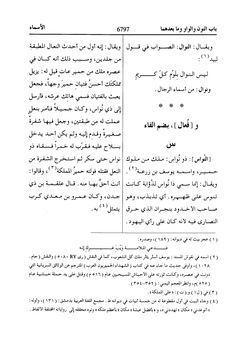 ويقال: إِنه أول من أحدث النعال المطبقة من جلدين، وسبب ذلك أنه كان في عصره ملك من حمير عاتٍ قيل له: يزيل مملكتَك أحسنُ فتيانِ حميرَ وجهاً، فجعل يعبث بالفتيان فسمي هاتِك عرشه، فأرسل إِلى ذي نُواس، وكان جميلًا فأمر بنعلٍ عملت له من طبقتين، وجعل فيها شفرةً صغيرةً وقدِم إِليه ولم يكن أحد يدخل بسلاح عليه فقرّب له خمراً فسقاه ذو نواس حتى سكر ثم استخرج الشفرة من النعل فقتله فولته حميرُ المملكة «3»، وقالوا: