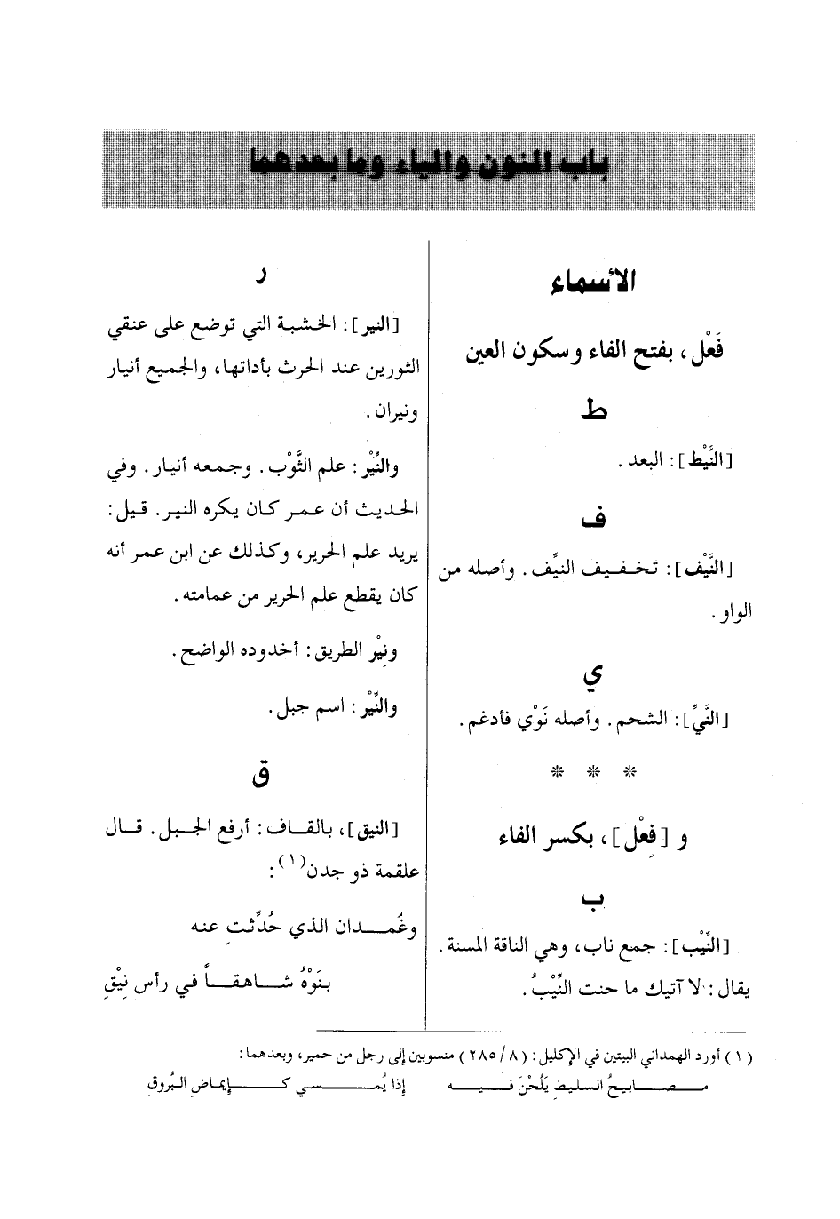 [النير]: الخشبة التي توضع على عنقي الثورين عند الحرث بأداتها، والجميع أنيار ونيران.