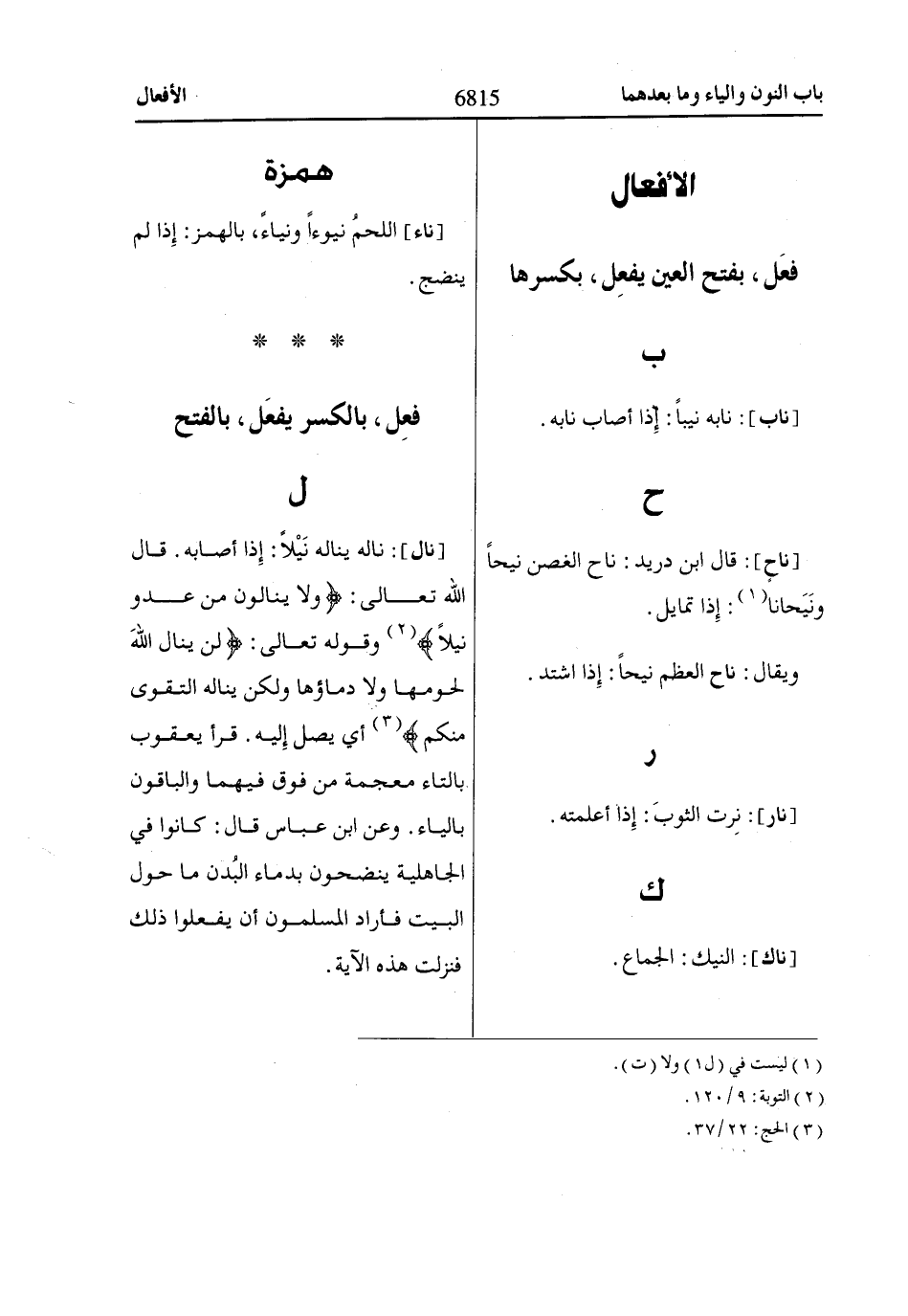 [نال]: ناله يناله نَيْلًا: إِذا أصابه. قال اللّاه تعالى: وَلاا يَناالُونَ مِنْ عَدُوٍّ نَيْلًا «2» وقوله تعالى: لَنْ يَناالَ اللّاهَ لُحُومُهاا وَلاا دِمااؤُهاا وَلاكِنْ يَناالُهُ التَّقْوى مِنْكُمْ «3» أي يصل إِليه. قرأ يعقوب بالتاء معجمة من فوق فيهما والباقون بالياء.