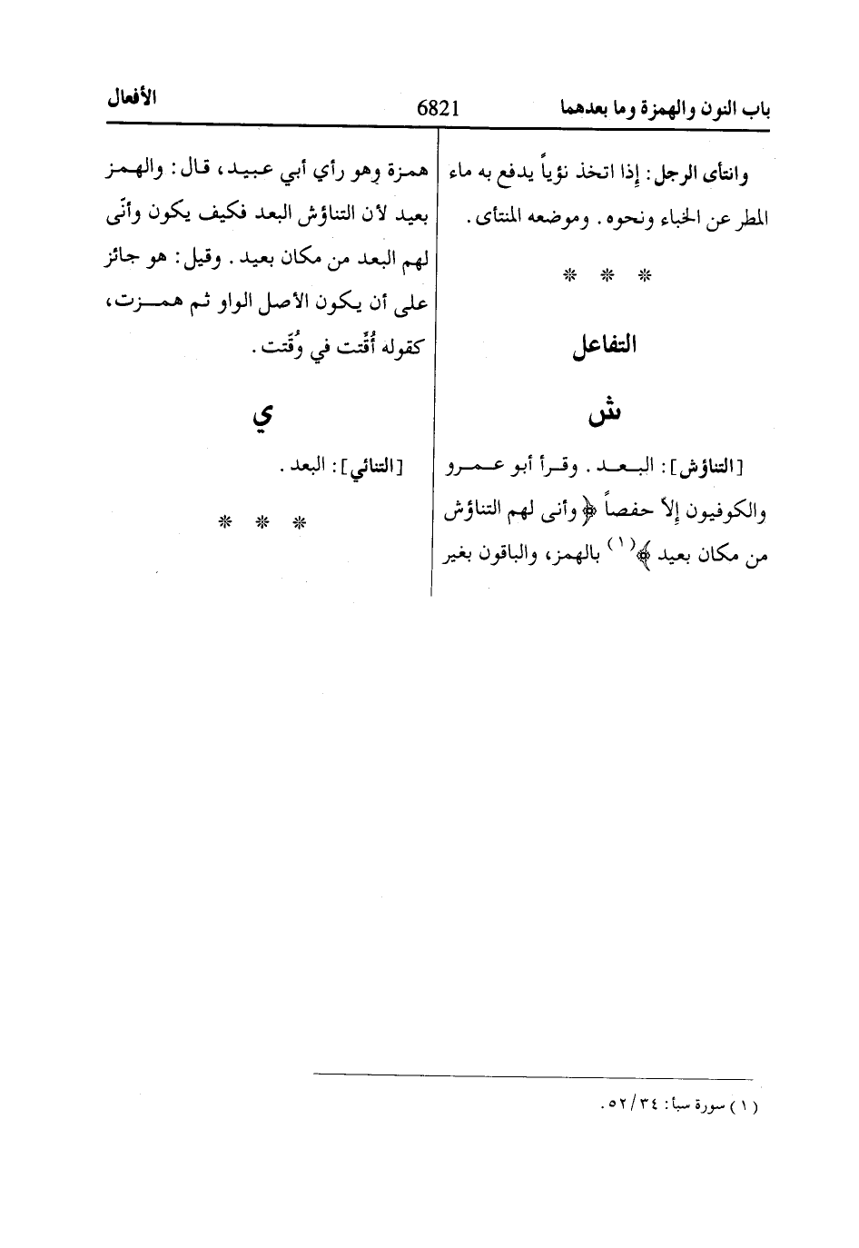 [التناؤش]: البعد. وقرأ أبو عمرو والكوفيون إِلّا حفصاً وأنى لهم التناؤش من مكان بعيد «1» بالهمز، والباقون بغير همزة وهو رأي أبي عبيد، قال: والهمز بعيد لأن التناؤش البعد فكيف يكون وأنّى لهم البعد من مكان بعيد. وقيل: هو جائز على أن يكون الأصل الواو ثم همزت، كقوله أُقِّتت في وُقّتت.