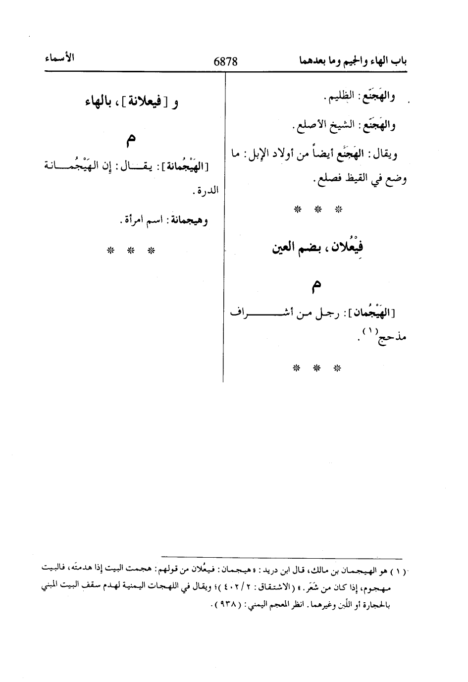 (1) هو الهيجمان بن مالك، قال ابن دريد: «هيجمان: فيعُلان من قولهم: هجمت البيت إِذا هدمتَه، فالبيت مهجوم، إِذا كان من شَعَر. » (الاشتقاق: 2/ 402)؛ ويقال في اللهجات اليمنية لهدم سقف البيت المبني بالحجارة أو اللِّبن وغيرهما. انظر المعجم اليمني: (938).