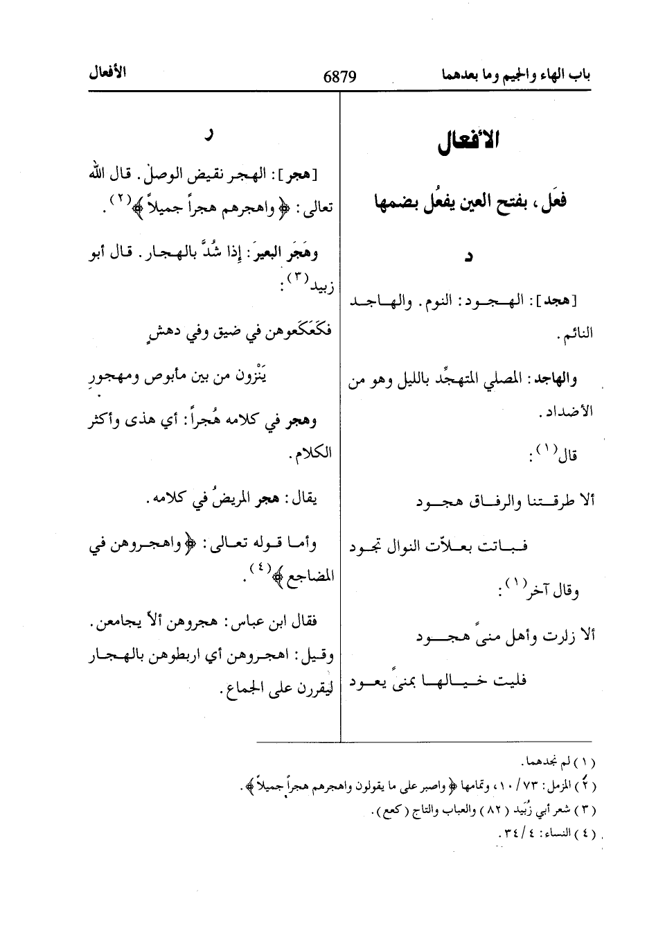[هجر]: الهجر نقيض الوصل. قال اللّاه تعالى: وَاهْجُرْهُمْ هَجْراً جَمِيلًا «2».