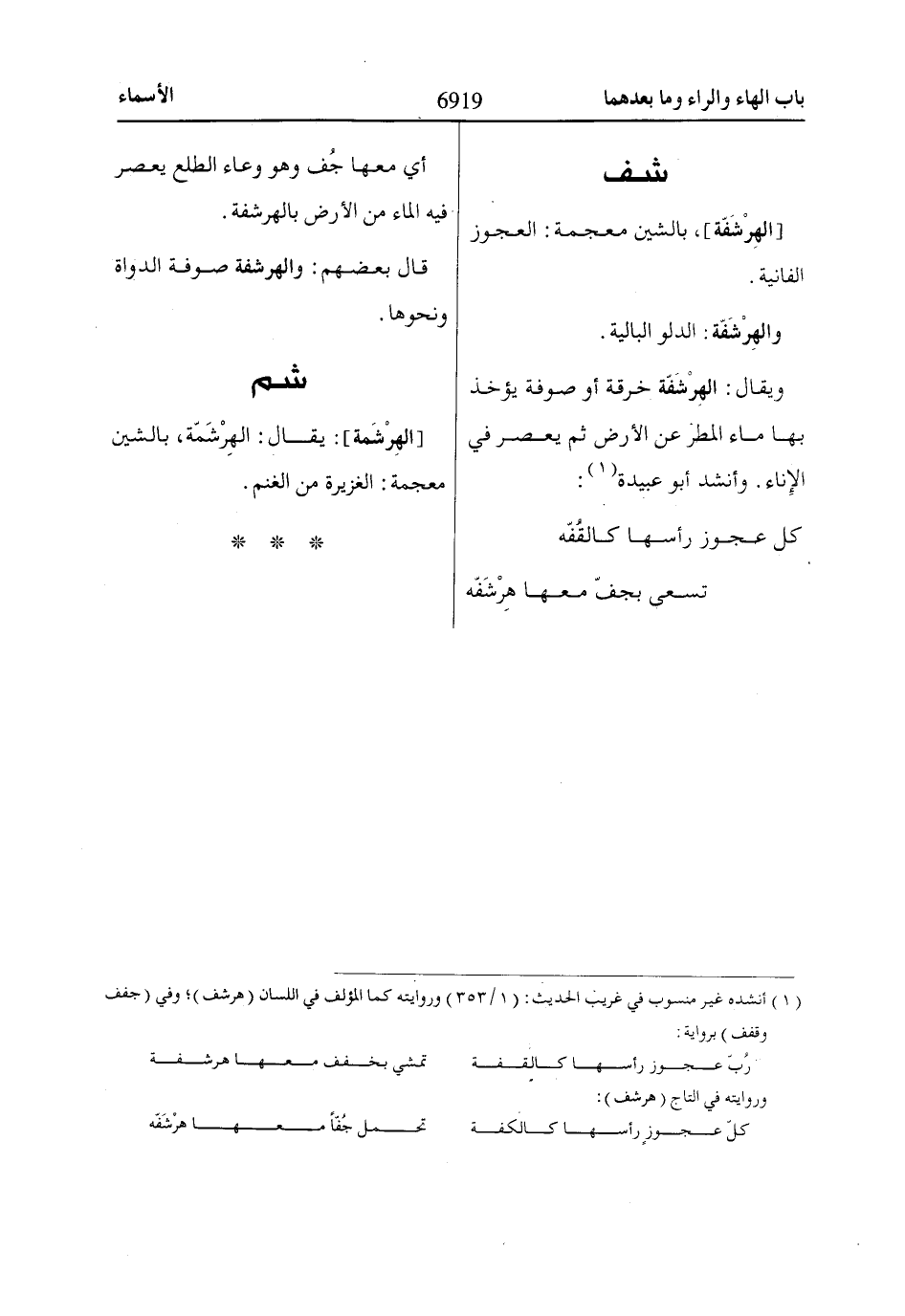 (1) أنشده غير منسوب في غريب الحديث: (1/ 353) وروايته كما المؤلف في اللسان (هرشف)؛ وفي (جفف وقفف) برواية: