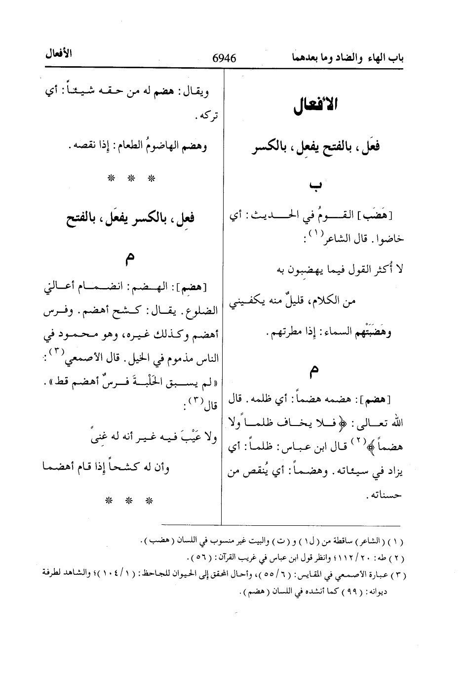 (3) عبارة الأصمعي في المقايس: (6/ 55)، وأحال المحقق إِلى الحيوان للجاحظ: (1/ 104)؛ والشاهد لطرفة ديوانه: (99) كما أنشده في اللسان (هضم).