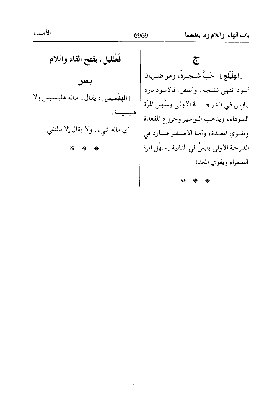 [الهَلَيْلج]: حَبُّ شجرةً، وهو ضربان أسود انتهى نضجه. وأصفر. فالأسود بارد يابس في الدرجة الأولى يسّهل المرّة السوداء، ويذهب البواسير وجروح المقعدة ويقوي المعدة، وأما الأصفر فبارد في الدرجة الأولى يابسٌ في الثانية يسهِّل المرّة الصفراء ويقوي المعدة.