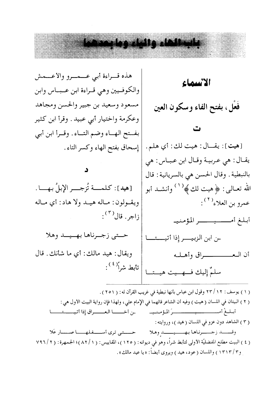 قال اللّاه تعالى: هَيْتَ لَكَ «1» وأنشد أبو عمرو بن العلاء «2»: