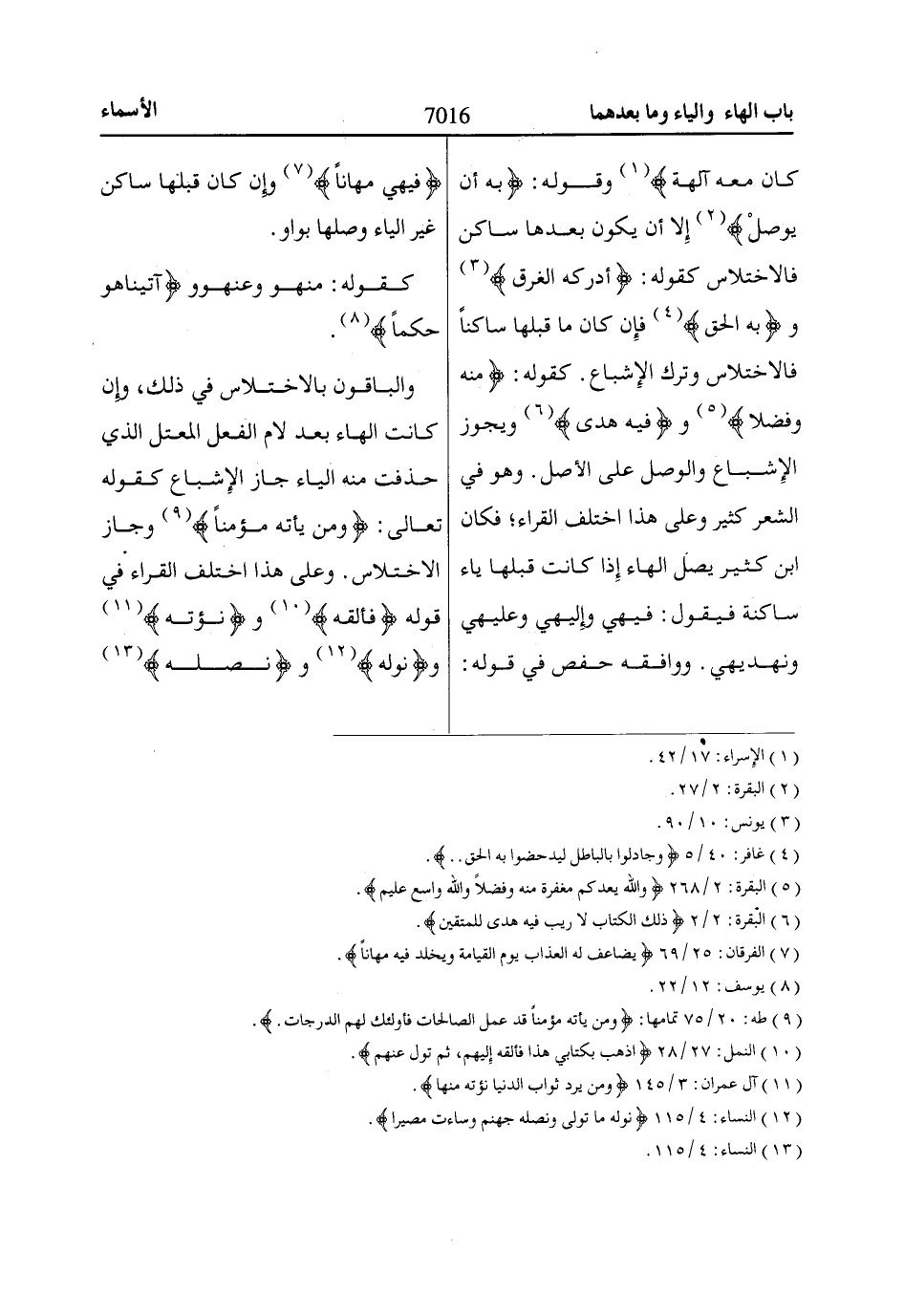 والباقون بالاختلاس في ذلك، وإِن كانت الهاء بعد لام الفعل المعتل الذي حذفت منه الياء جاز الإِشباع كقوله تعالى: وَمَنْ يَأْتِهِ مُؤْمِناً «9» وجاز الاختلاس. وعلى هذا اختلف القراء في قوله فَأَلْقِهْ «10» ونُؤْتِهِ* «11» ونُوَلِّهِ «12» ونُصْلِهِ «13»