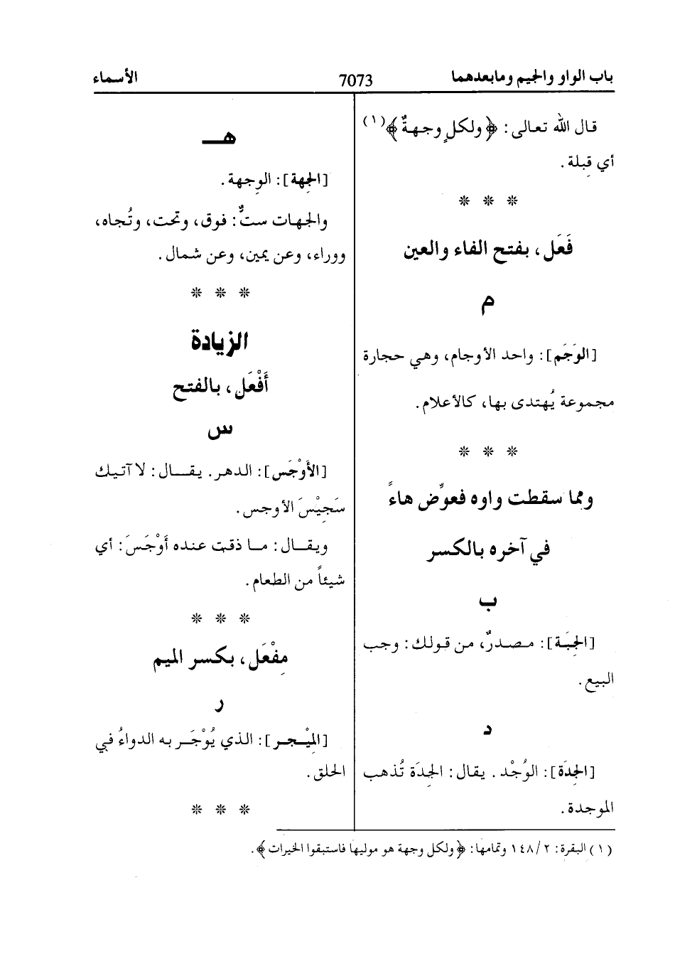 والجهات ستٌّ: فوق، وتحت، وتُجاه، ووراء، وعن يمين، وعن شمال.