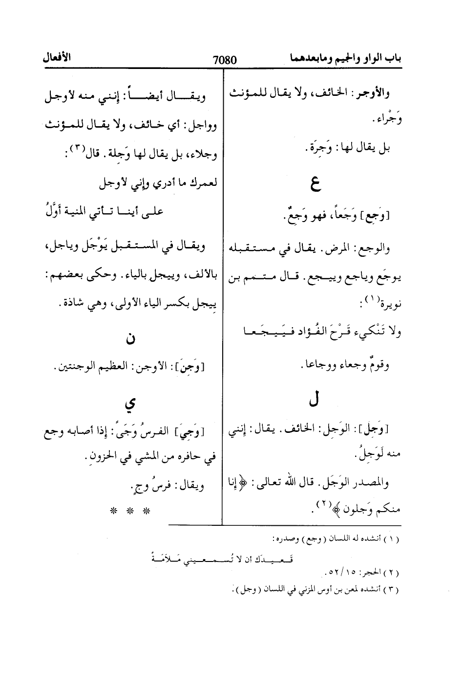 والمصدر الوَجَل. قال اللّاه تعالى: إِنّاا مِنْكُمْ وَجِلُونَ «2».