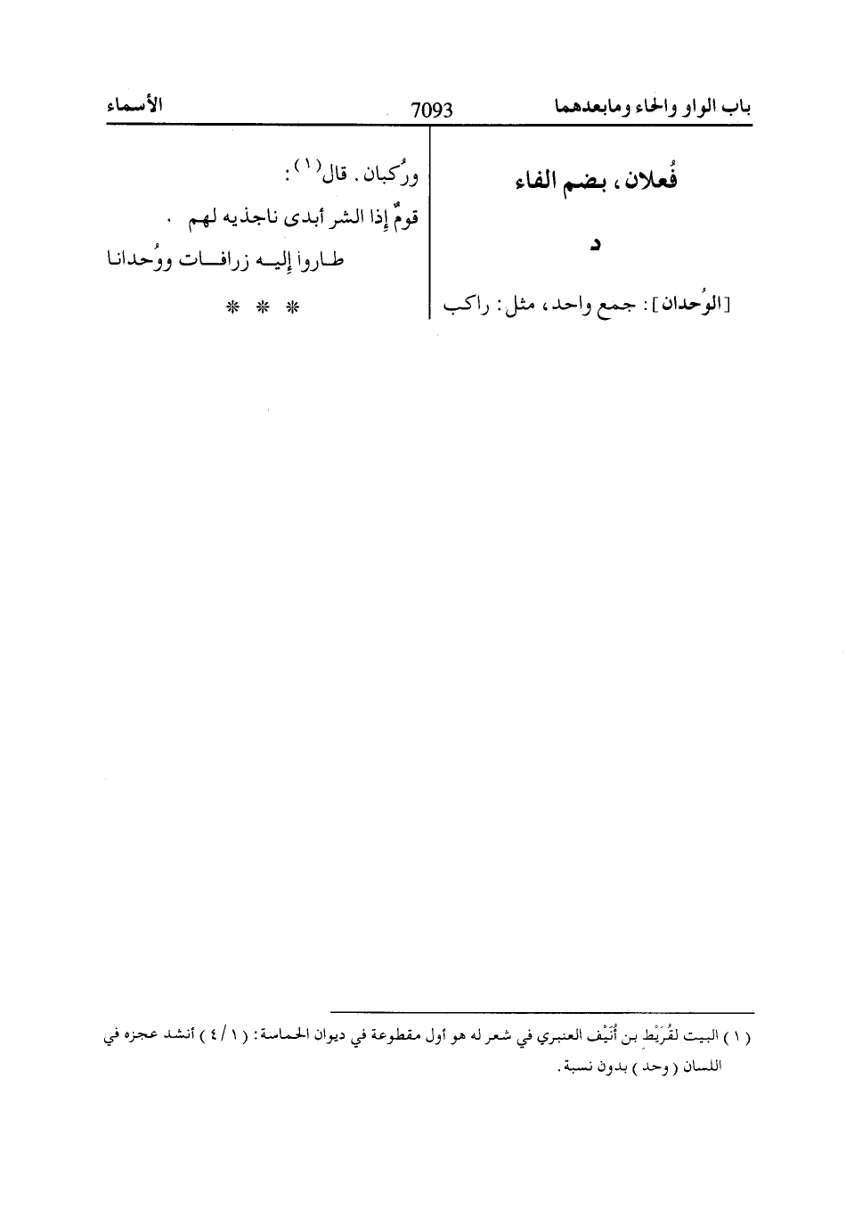 (1) البيت لقُرَيط بن أُنَيف العنبري في شعر له هو أول مقطوعة في ديوان الحماسة: (1/ 4) أنشد عجزه في اللسان (وحد) بدون نسبة.