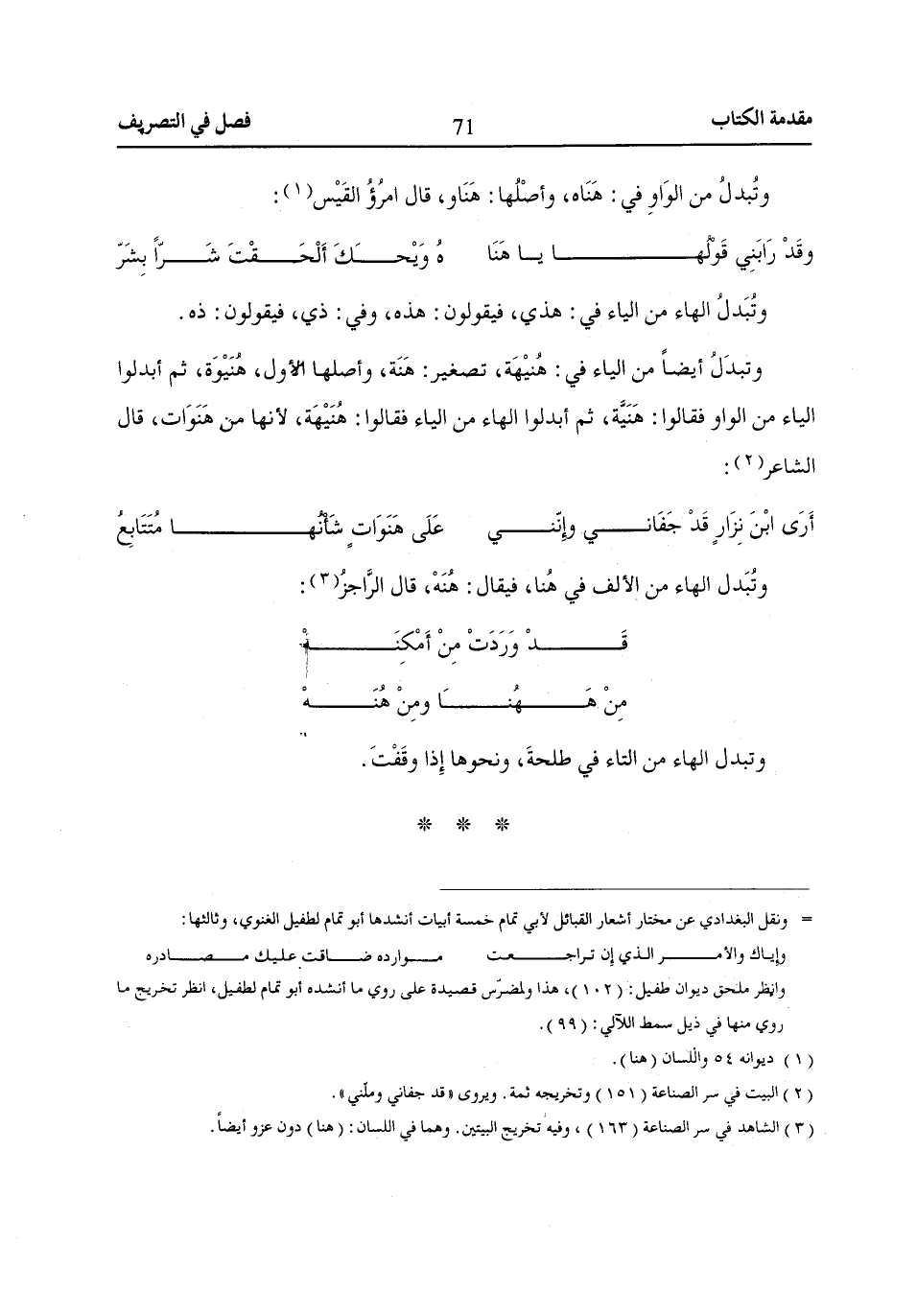 وتبدَلُ أيضاً من الياء في: هُنيْهَة، تصغير: هَنَة، وأصلها الأول، هُنَيْوَة، ثم أبدلوا الياء من الواو فقالوا: هَنَيَّة، ثم أبدلوا الهاء من الياء فقالوا: هُنَيْهَة، لأنها من هَنَوَات، قال الشاعر «2»:
