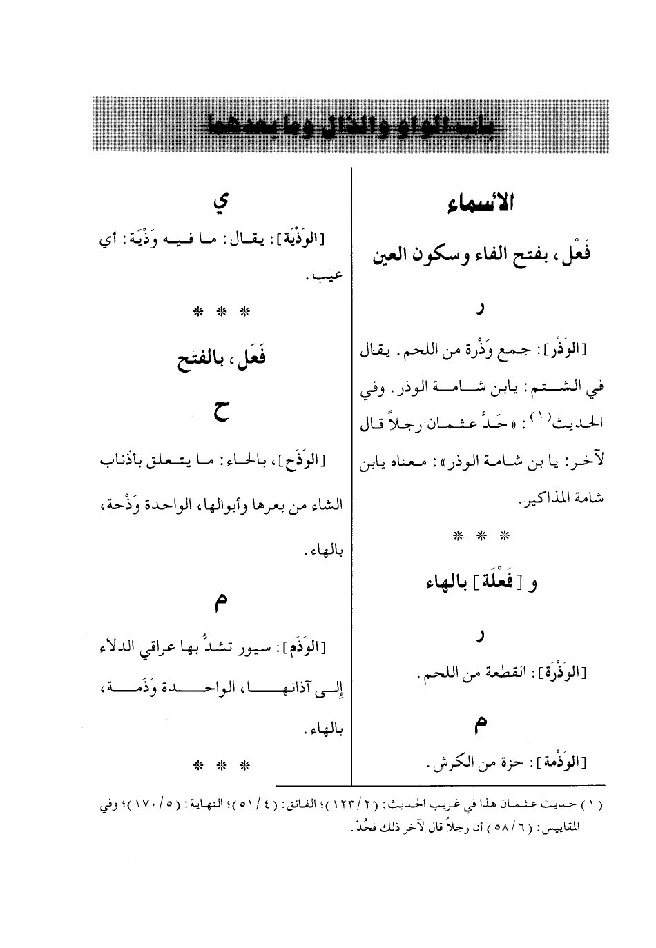 (1) حديث عثمان هذا في غريب الحديث: (2/ 123)؛ الفائق: (4/ 51)؛ النهاية: (5/ 170)؛ وفي المقاييس: (6/ 58) أن رجلًا قال لآخر ذلك فحُدّ.