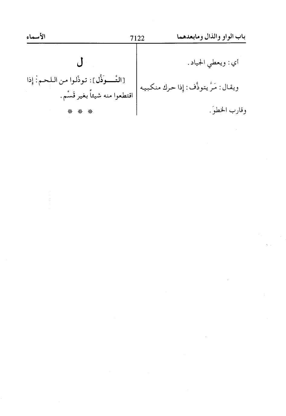 [التَّوَذُّل]: توذّلوا من اللحم: إِذا اقتطعوا منه شيئاً بغير قَسْم.
