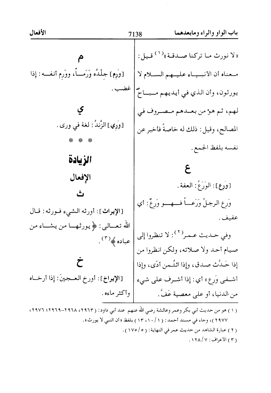 [الإِيراث]: أورثه الشيء فورثه: قال اللّاه تعالى: يُورِثُهاا مَنْ يَشااءُ مِنْ عِباادِهِ «3».